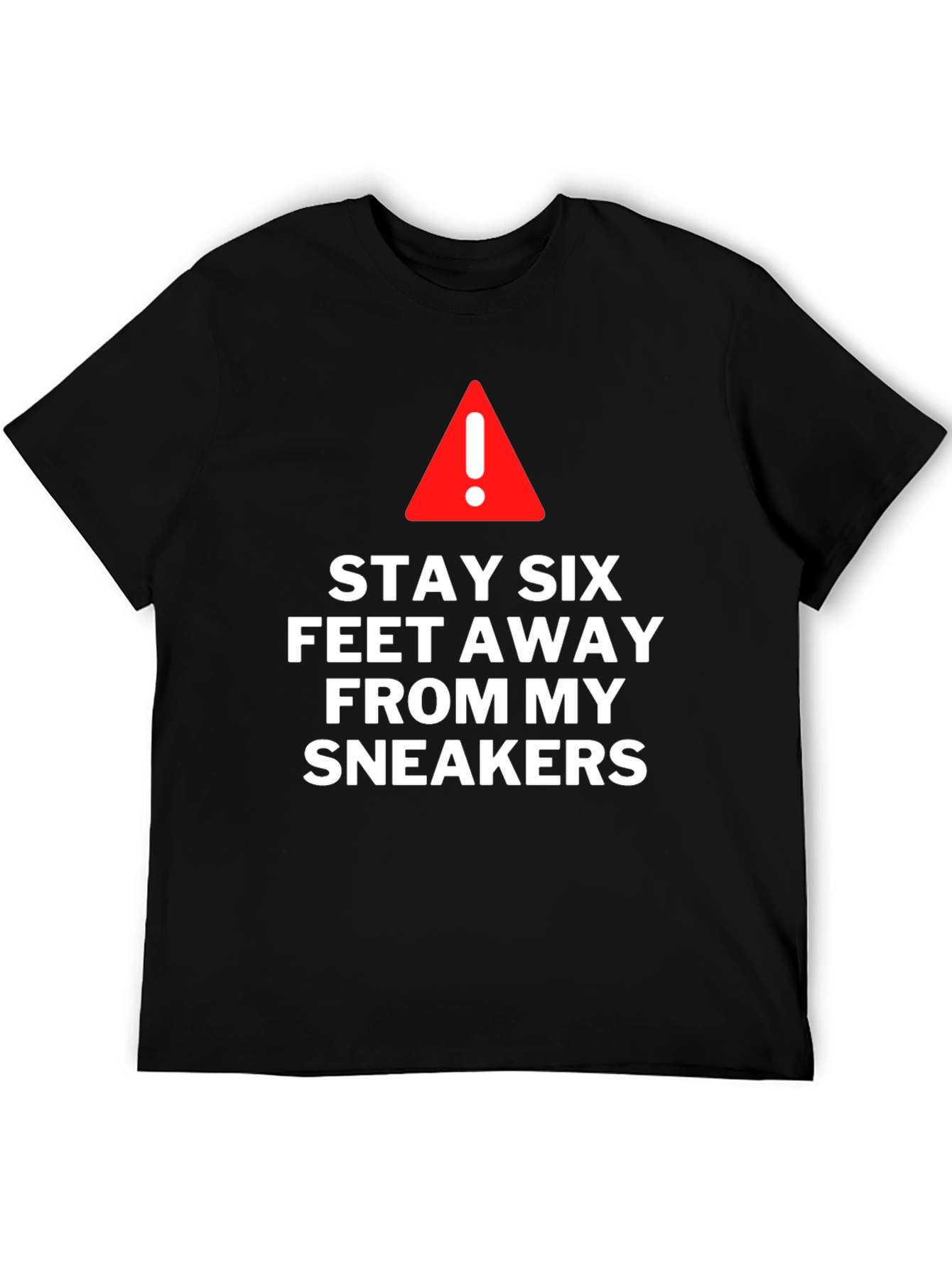 This black t-shirt features a humorous graphic design for sneaker enthusiasts. The bold white text "STAY SIX FEET AWAY FROM MY SNEAKERS" is prominently displayed beneath a red exclamation point triangle. The shirt is made of comfortable material, perfect for casual wear. It's a great way to express your love for sneakers and maintain social distance with a touch of humor. Ideal for everyday wear, sneaker conventions, or casual outings with friends. Let everyone know to respect the distance between them and your kicks!