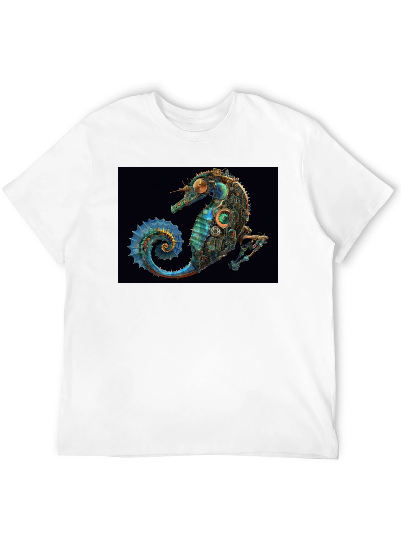 Show off your unique style with this eye-catching black t-shirt featuring a steampunk-inspired seahorse design. The intricate graphic showcases a mechanical seahorse with gears, cogs, and metallic accents, all rendered in vibrant shades of blue, gold, and copper. Made from soft, breathable fabric, this tee offers both comfort and style. Perfect for casual wear, concerts, or adding a touch of whimsy to your everyday look. Stand out from the crowd and express your love for imaginative art with this must-have graphic tee.