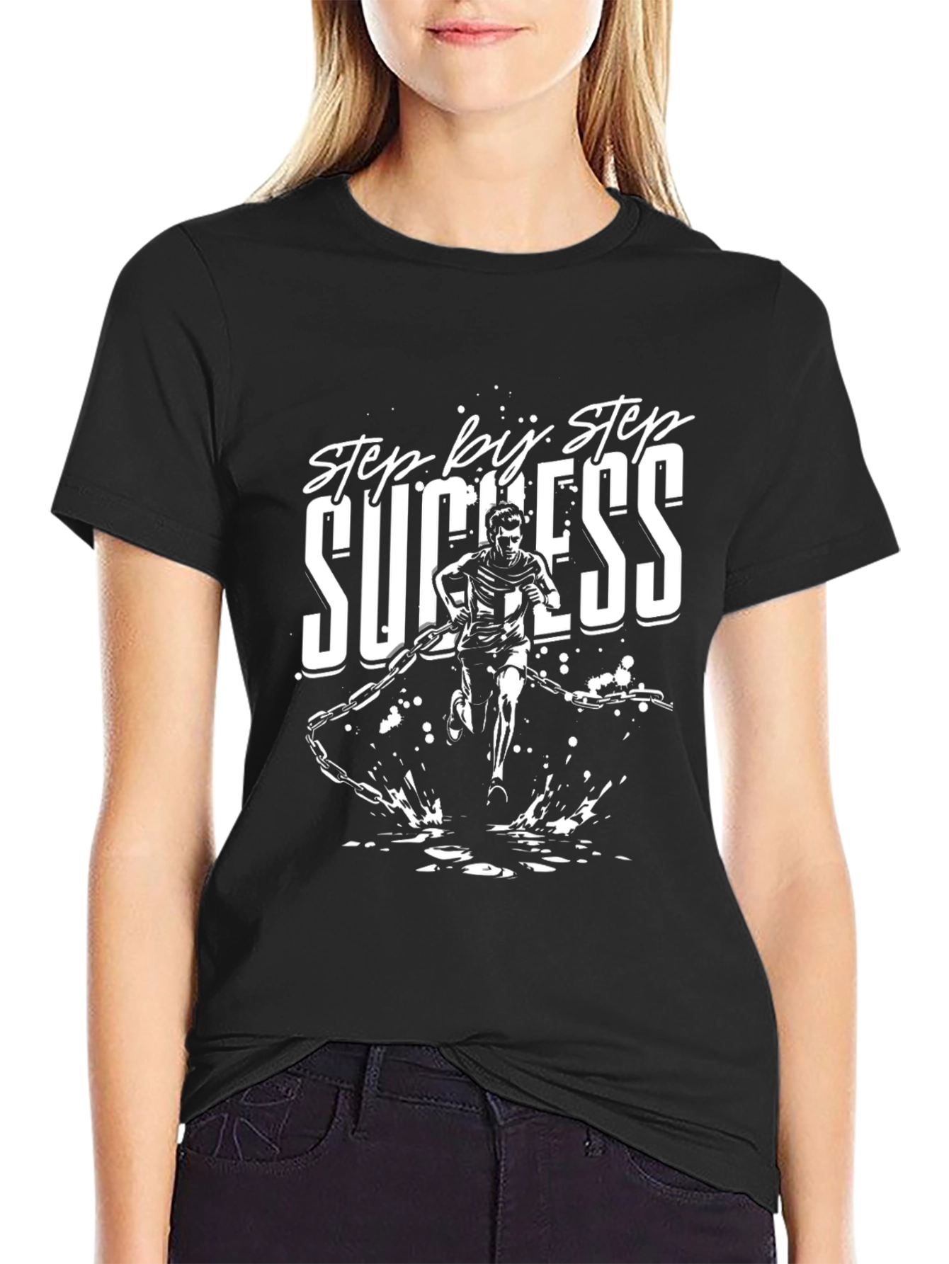 Achieve your goals in style with this striking black graphic t-shirt. Featuring a bold design that reads "Step by Step SUCCESS", this shirt embodies the spirit of determination and perseverance. The dynamic graphic includes a runner breaking chains, symbolizing overcoming obstacles on the path to achievement. Made from a comfortable, breathable fabric, this tee is perfect for workouts, casual outings, or simply making a statement. Show off your commitment to success with this unique and inspiring t-shirt.