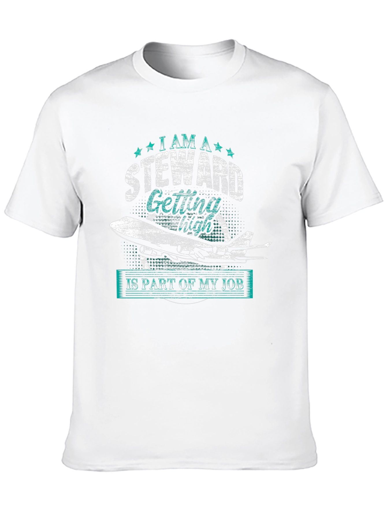 This black t-shirt features a bold and humorous design for stewards. The graphic showcases the text "I AM A STEWARD Getting High IS PART OF MY JOB" in a distressed, vintage style font, and it is decorated with an airplane image. The playful message and aviation theme make it a great conversation starter and a fun way to express your personality. Made from comfortable fabric, this tee is ideal for casual wear. The classic fit ensures a relaxed and flattering silhouette. Wear it to work, social gatherings, or simply while running errands to showcase your unique sense of humor and passion for aviation.