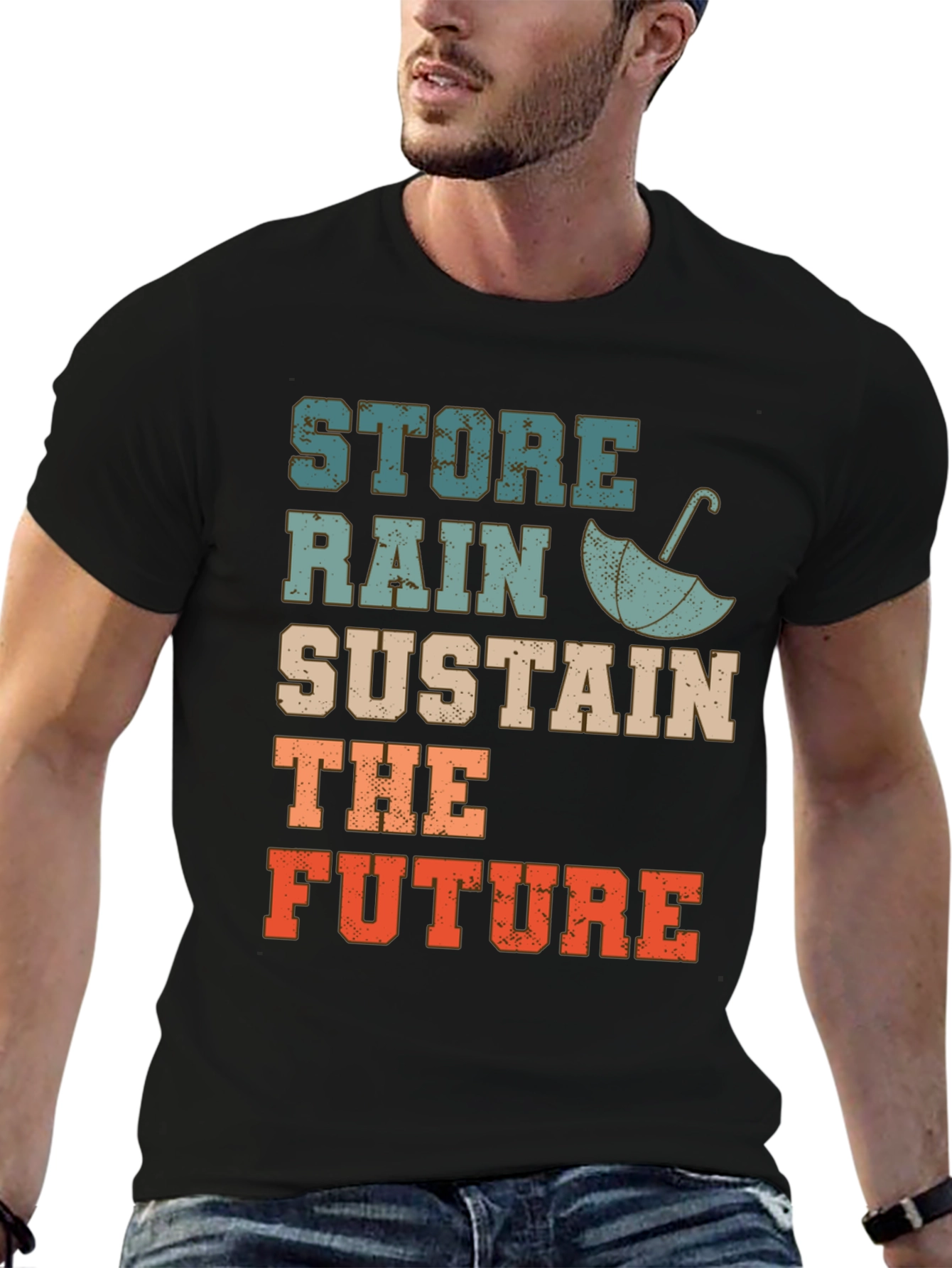 Show your commitment to a greener world with this stylish graphic tee! The shirt features a bold design with the words "Store Rain Sustain The Future" in a vintage, distressed font. An umbrella graphic accents the word "Rain". The text is rendered in a retro color palette of blue, beige and orange, creating a cool, vintage vibe. This tee is ideal for casual wear, environmental awareness events, or as a conversation starter. Made from a soft, breathable fabric, it will keep you comfortable all day long. Wear your values with pride and let this shirt be a reminder to conserve and protect our planet!