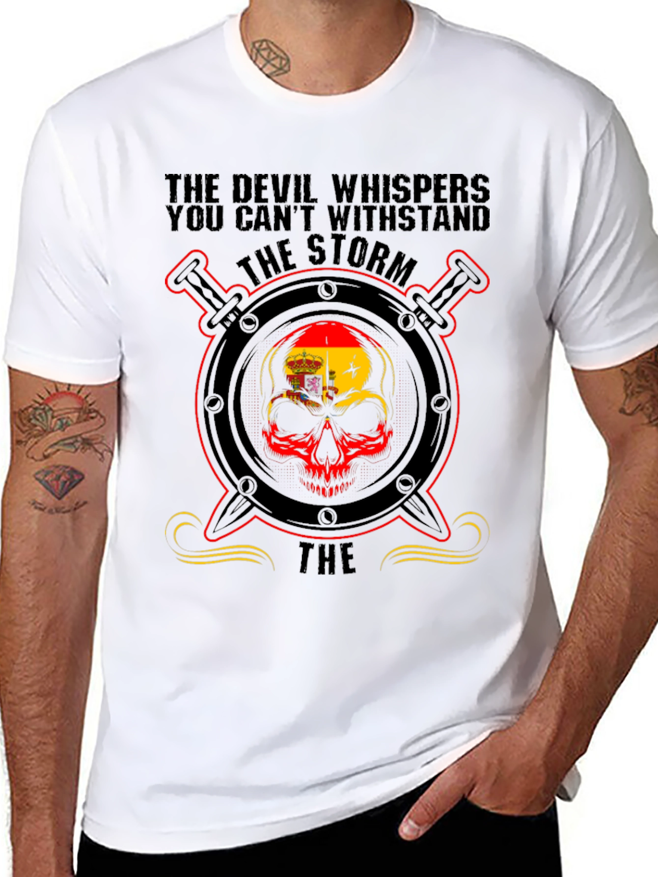 Embrace the storm with this striking black graphic tee. Featuring a bold skull design with the Spanish flag incorporated in its details, encircled by crossed swords on a black shield with a red outline. The text "The Devil Whispers You Can't Withstand The Storm" is prominently displayed above the design, while "The" is written at the bottom. The tee is a classic fit, perfect for casual wear or making a statement. Ideal for those who appreciate unique graphic designs and want to showcase their edgy style. Made from comfortable material for all-day wear. A must-have addition to any wardrobe.