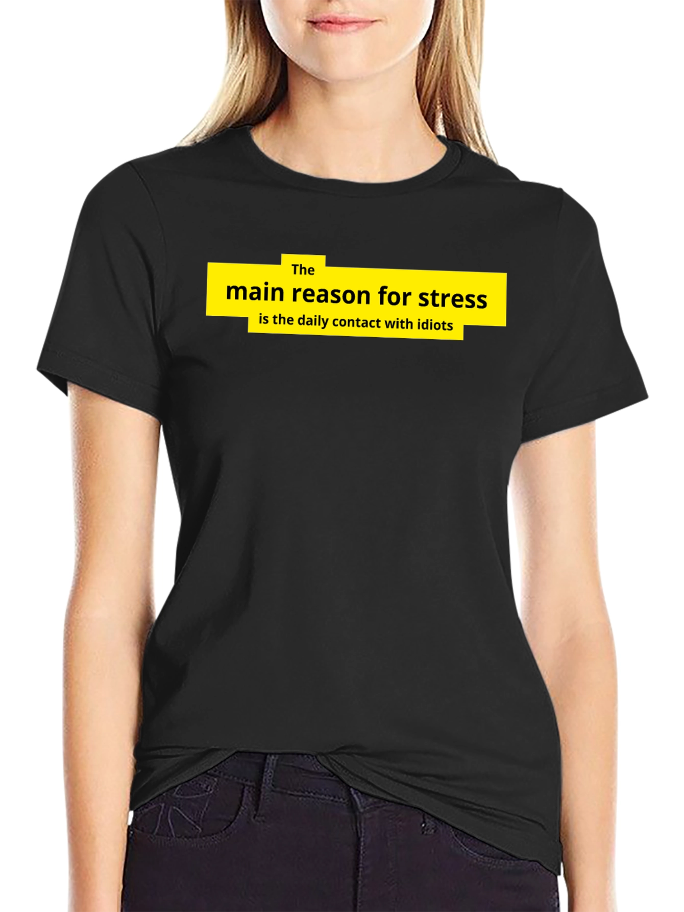 This black cotton t-shirt features a bold graphic design that makes a statement. A yellow banner highlights the phrase "The main reason for stress is the daily contact with idiots". Made from comfortable, breathable cotton, this tee is perfect for everyday wear. The short-sleeve design and classic fit ensure a relaxed and casual look. Ideal for anyone with a sense of humor, this shirt is a great conversation starter and a fun addition to any wardrobe. Whether you're running errands, hanging out with friends, or just relaxing at home, this t-shirt offers both comfort and style. Express yourself with this unique and eye-catching graphic tee!