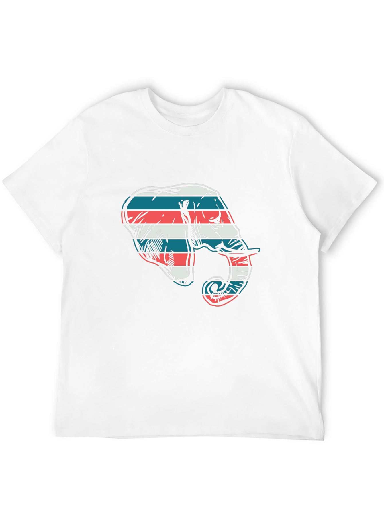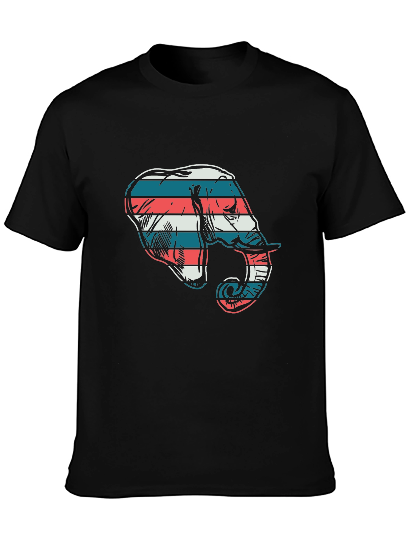 Showcase your unique style with this eye-catching graphic tee! This black t-shirt features a bold, stylized elephant head design with horizontal stripes in shades of white, teal, and red. The design has a hand-drawn, vintage feel that adds to its appeal. Made from a soft, comfortable fabric, this shirt is perfect for everyday wear, whether you're hanging out with friends, running errands, or just relaxing at home. Its versatile design makes it easy to pair with jeans, shorts, or even dress pants for a more stylish look. Add a touch of creativity to your wardrobe with this striking graphic tee.