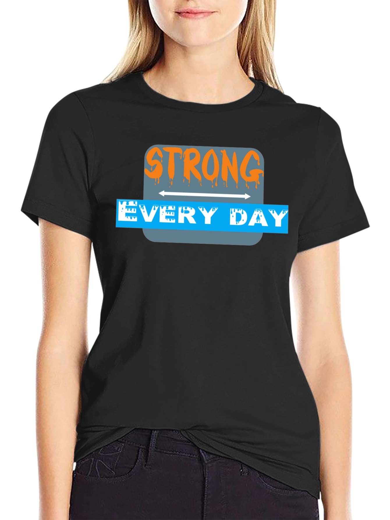 Show your strength with this unique graphic tee. The design features the word "STRONG" in orange with a dripping effect and "EVERY DAY" below in bold blue letters, separated by a double arrow. The design is set against a grey background. Made from comfortable, breathable fabric, this classic black t-shirt is perfect for everyday wear, whether you're hitting the gym or hanging out with friends. Express your motivation and stay stylish with this must-have addition to your wardrobe.
