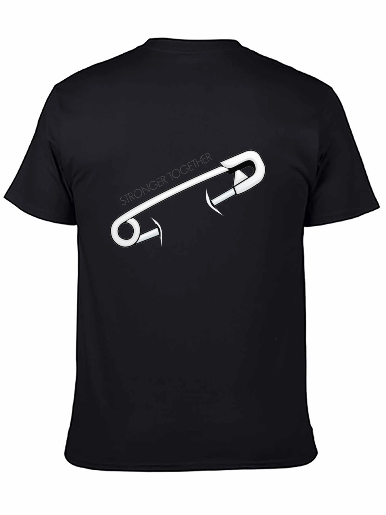 Show your solidarity with this impactful black graphic tee. This stylish and comfortable shirt features a clean white safety pin design, symbolizing unity and support. The subtle "Stronger Together" text adds a powerful message without being overwhelming. Made from what appears to be soft, breathable cotton, this tee is perfect for everyday wear, rallies, or expressing your values. The minimalist design pairs well with jeans, shorts, or a casual jacket. Spread a positive message and make a statement with this inspiring tee.