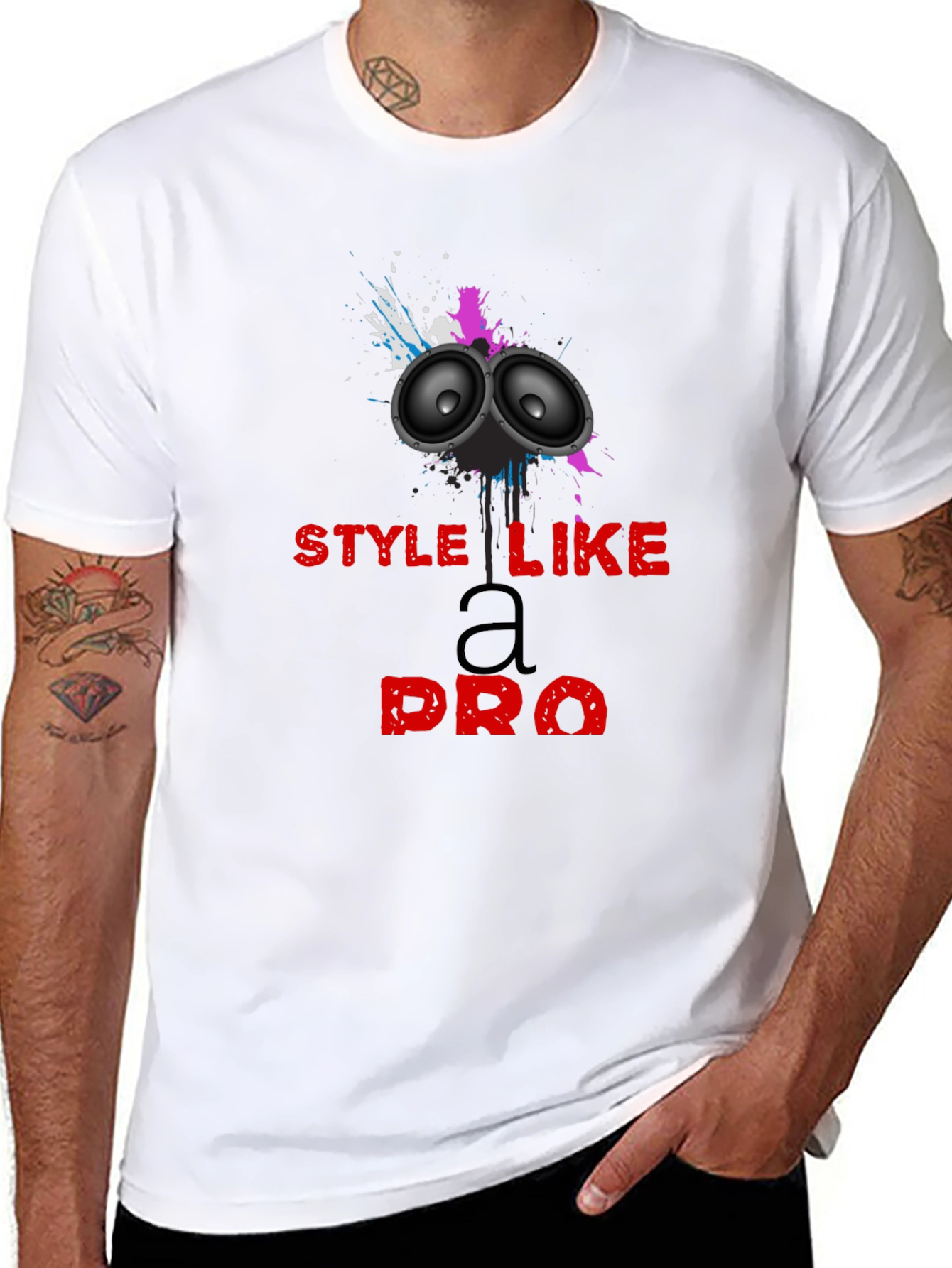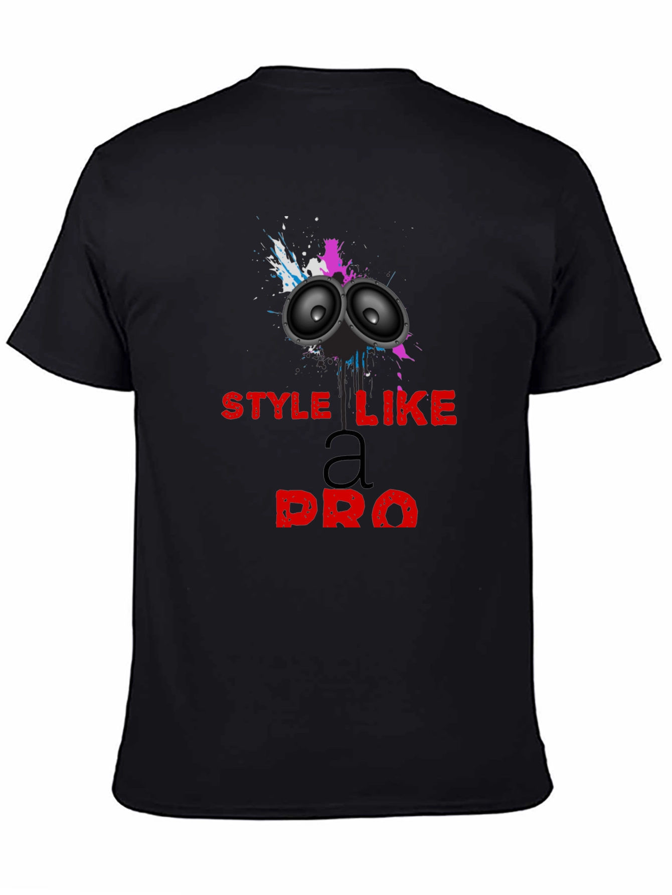 Showcase your unique style with this eye-catching black graphic tee. The shirt features a vibrant design of stylized speakers surrounded by artistic paint splatters, making a bold statement. The phrase "Style Like a PRO" is prominently displayed in a distressed red font, adding an edgy touch. Made from a comfortable, breathable fabric, this tee is perfect for everyday wear or a night out. Pair it with jeans or shorts for a casual yet stylish look. A must-have for music lovers and trendsetters alike, this tee lets you express your passion and attitude with confidence.