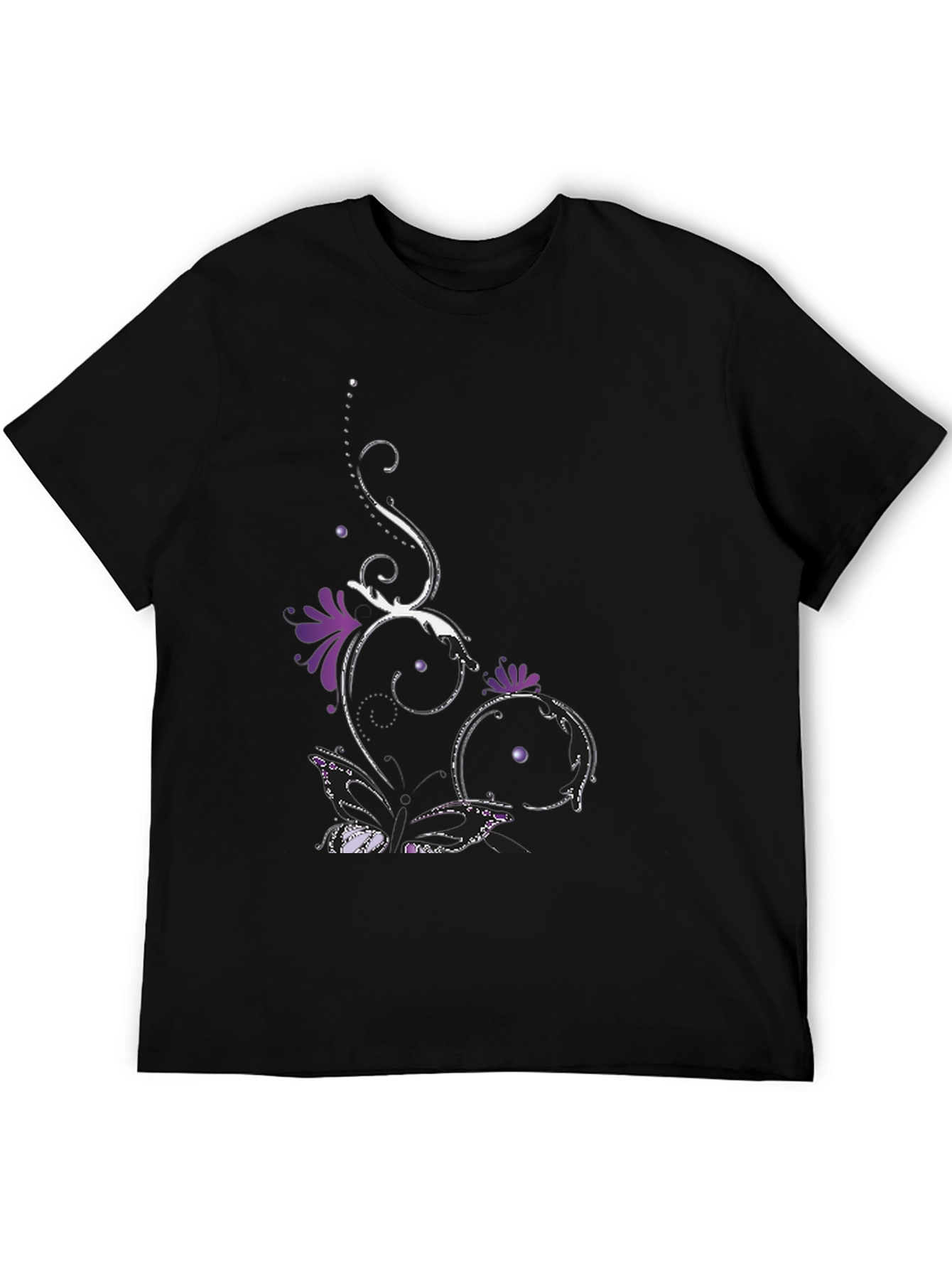 Elevate your casual style with this sleek black t-shirt featuring a unique floral and butterfly design. The intricate white and purple graphics create a striking contrast against the dark fabric, making it a standout piece in any wardrobe. Made from a comfortable, breathable material, this tee is perfect for everyday wear, whether you're running errands or meeting friends. The design adds a touch of artistic flair, making it suitable for those who appreciate unique and eye-catching apparel. Pair it with jeans, shorts, or a skirt for a versatile look that expresses your individuality.