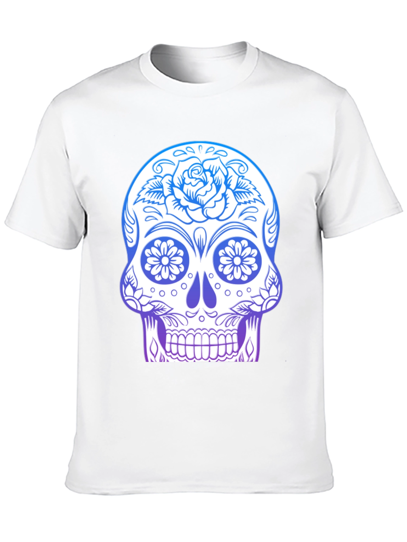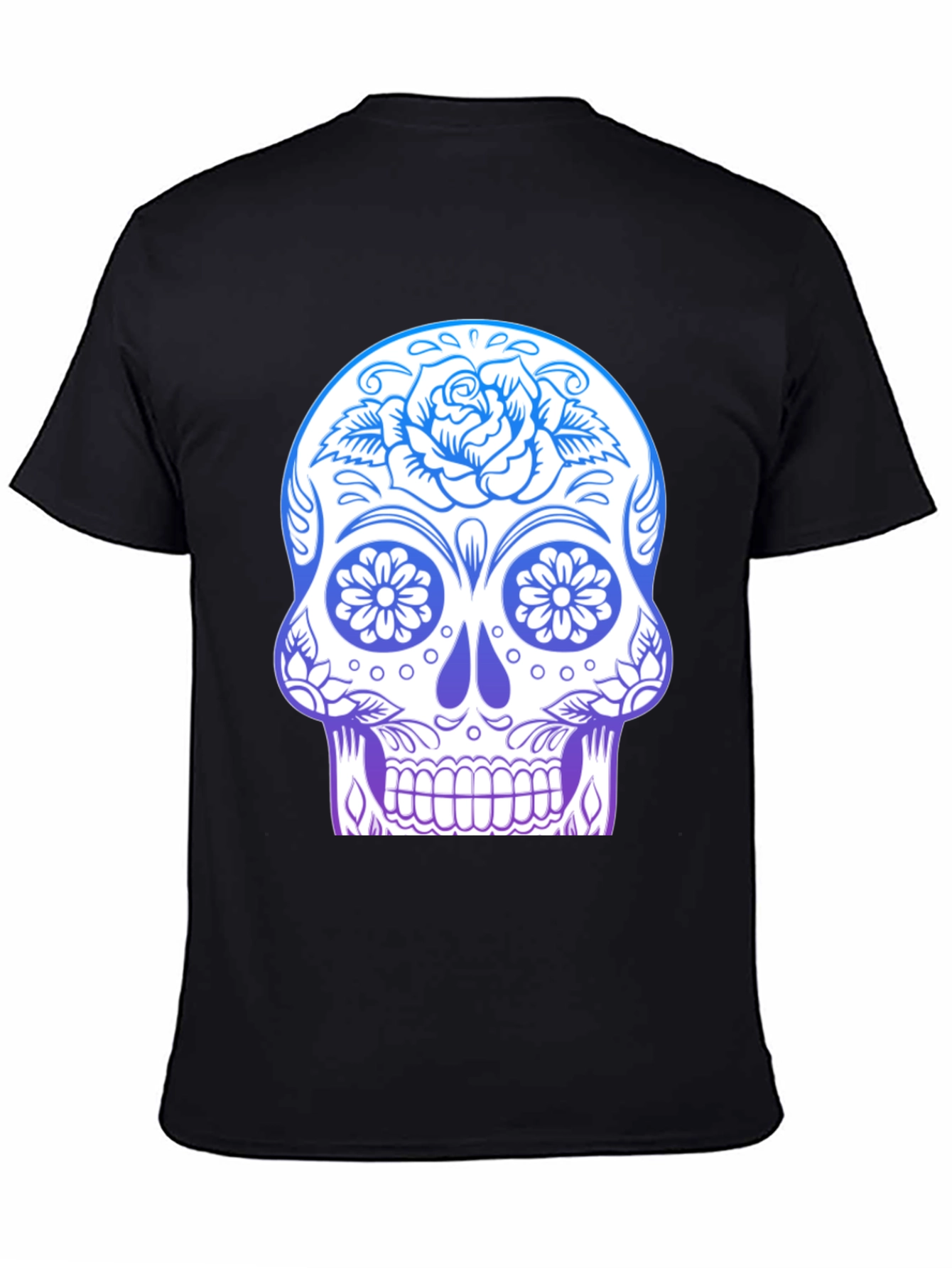 Embrace the vibrant spirit of Día de los Muertos with this striking sugar skull t-shirt. The tee features a detailed sugar skull graphic, adorned with intricate floral designs and a captivating gradient of blues and purples. The clean white base of the skull ensures the colorful details pop. Made from comfortable, breathable fabric, this black tee offers a relaxed fit perfect for everyday wear or special occasions. Whether you're celebrating the Day of the Dead or simply love bold, artistic designs, this t-shirt is a unique statement piece that combines cultural appreciation with contemporary style. Show off your love for art and culture with this must-have addition to your wardrobe.
