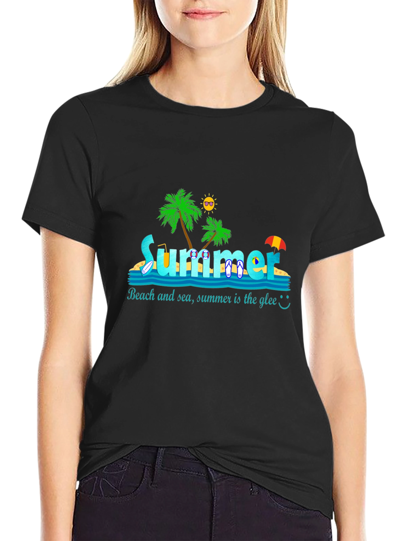 Embrace the summer vibe with this stylish black t-shirt! Featuring a vibrant design with palm trees, a cheerful sun wearing sunglasses, and the word "Summer" playfully integrated into a beach scene. The shirt also includes the phrase "Beach and sea, summer is the glee :) " This tee is perfect for beach lovers, vacation goers, or anyone who wants to carry the summer spirit with them. Made from a comfortable, breathable fabric, it's ideal for warm weather and casual occasions. Let the good times roll with this fun and festive tee!