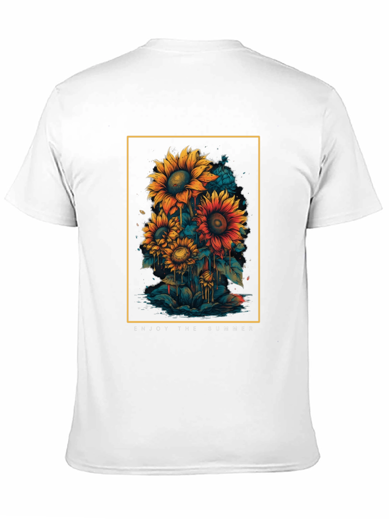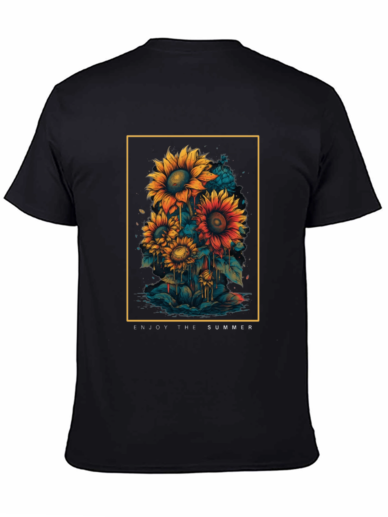 Embrace the warmth of summer with this vibrant graphic tee. Featuring a stunning sunflower design encased in a rectangular frame, this black t-shirt is a stylish way to express your love for nature. The detailed artwork showcases sunflowers in rich, warm tones. The words "ENJOY THE SUMMER" are printed below the floral design. This tee is perfect for casual outings, summer events, or simply adding a pop of color to your everyday wardrobe. Made from comfortable materials, it offers a relaxed fit for all-day wear. Stand out in style and let the sunshine in with this eye-catching tee!