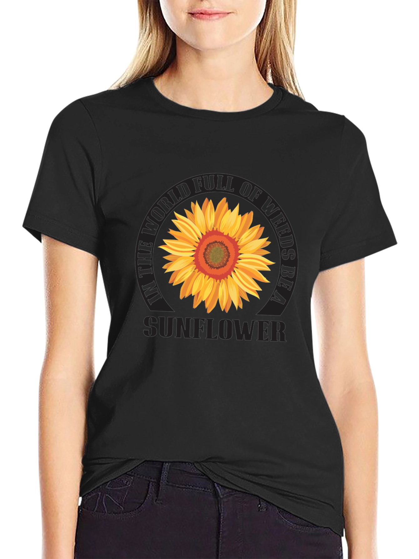 Embrace positivity with this stylish black graphic tee! Featuring a vibrant sunflower design surrounded by the inspiring message "In a world full of weeds be a sunflower," this shirt is sure to brighten your day. Made from soft, comfortable fabric, it's perfect for casual wear. The unique design makes it a great conversation starter, and the classic fit ensures a flattering look. Ideal for everyday wear, summer outings, or as a thoughtful gift for someone special. Show off your sunny side with this standout tee!