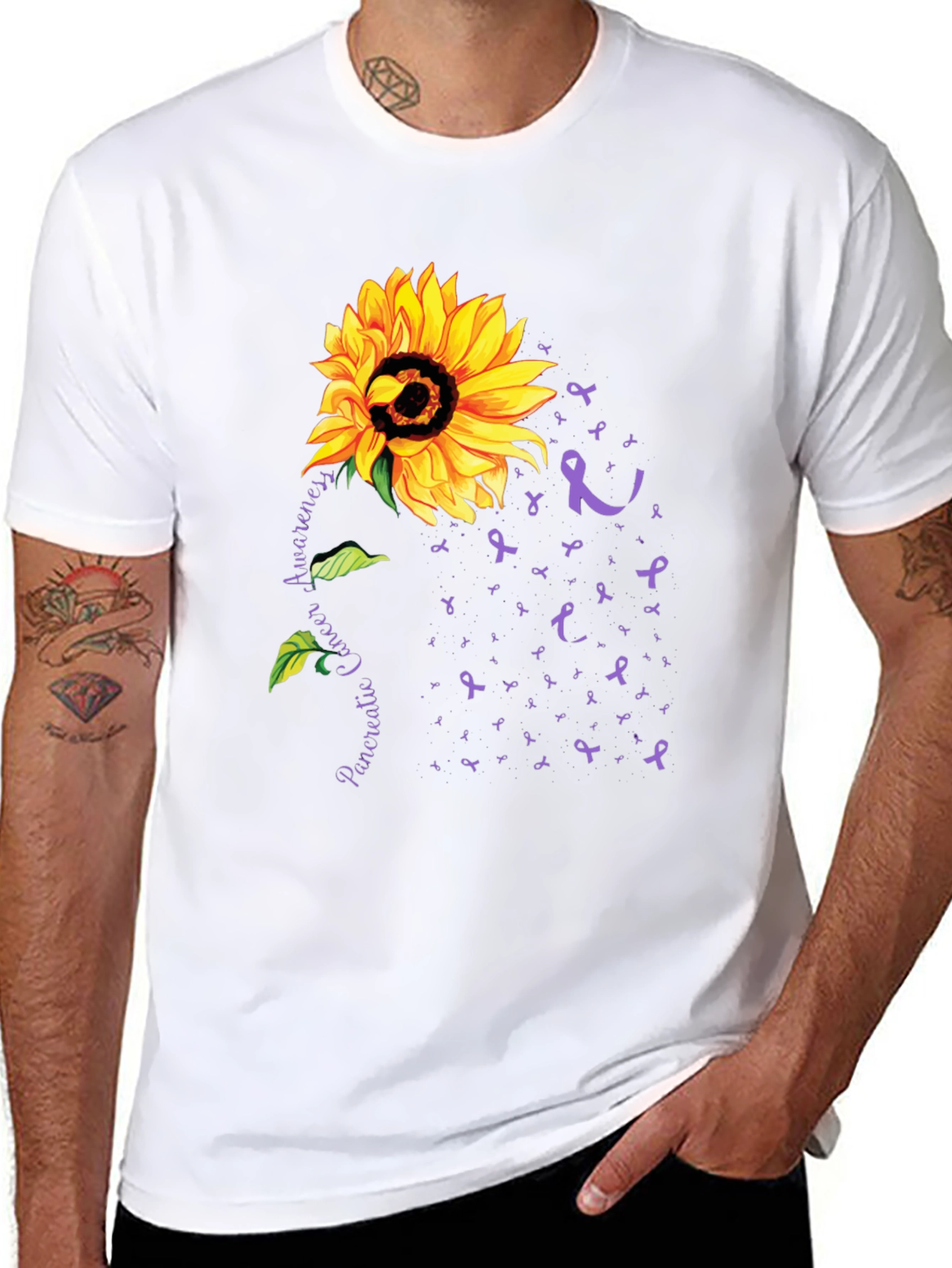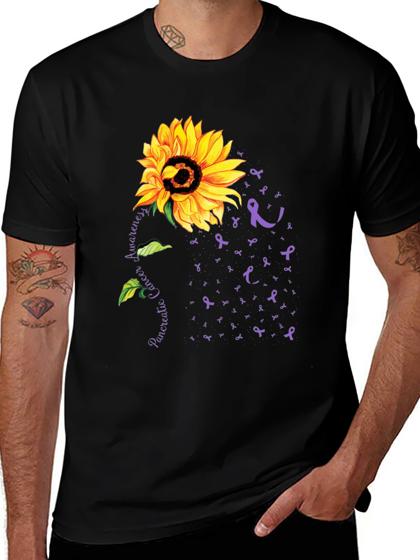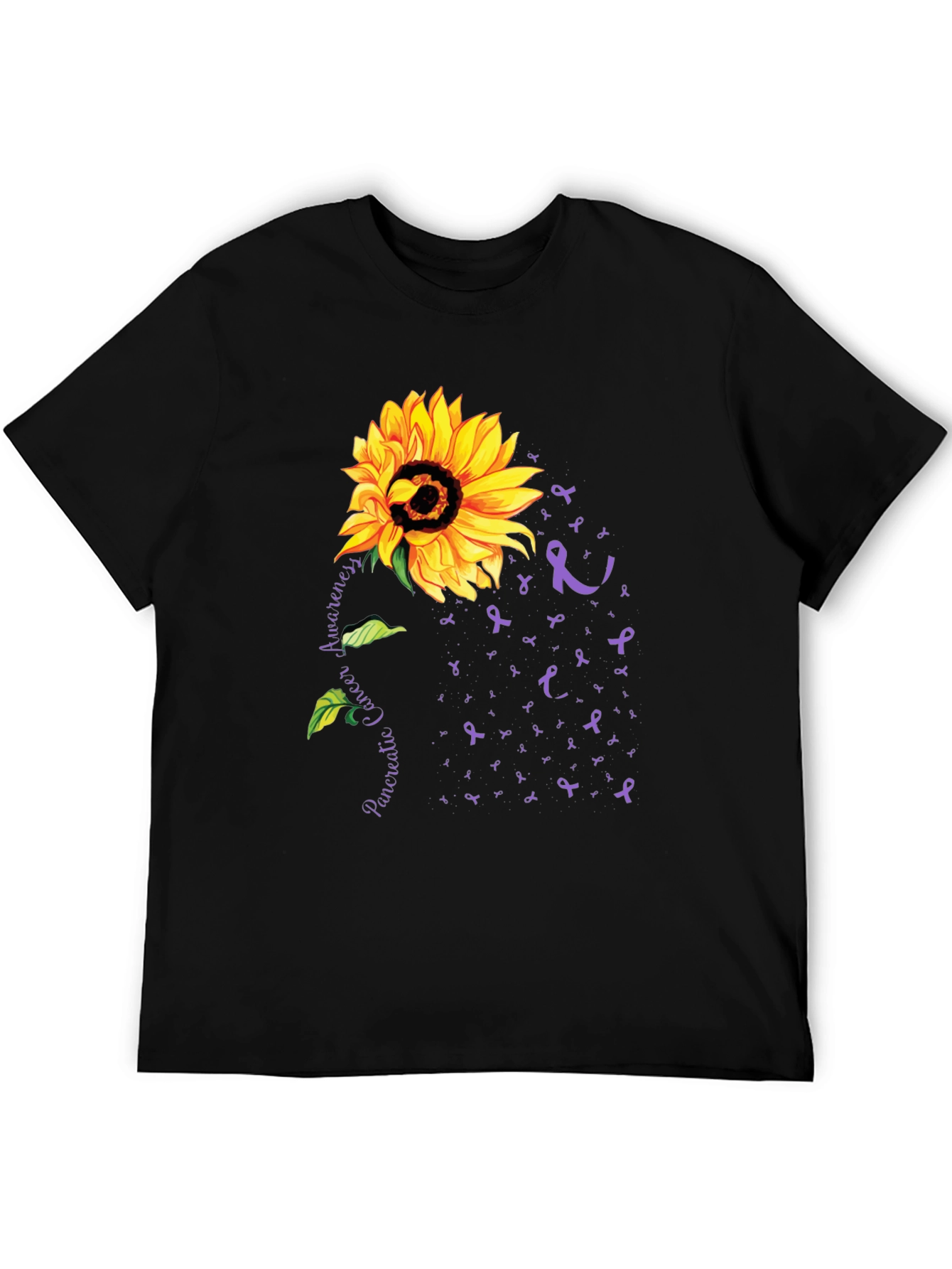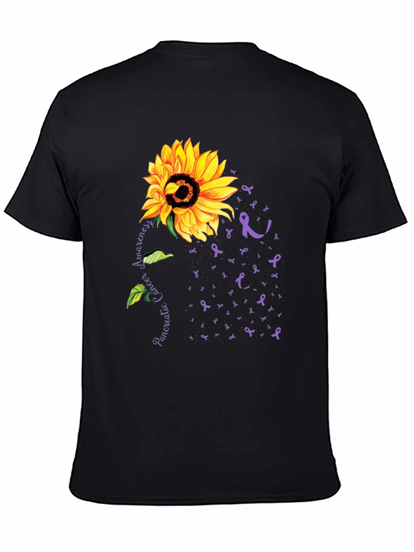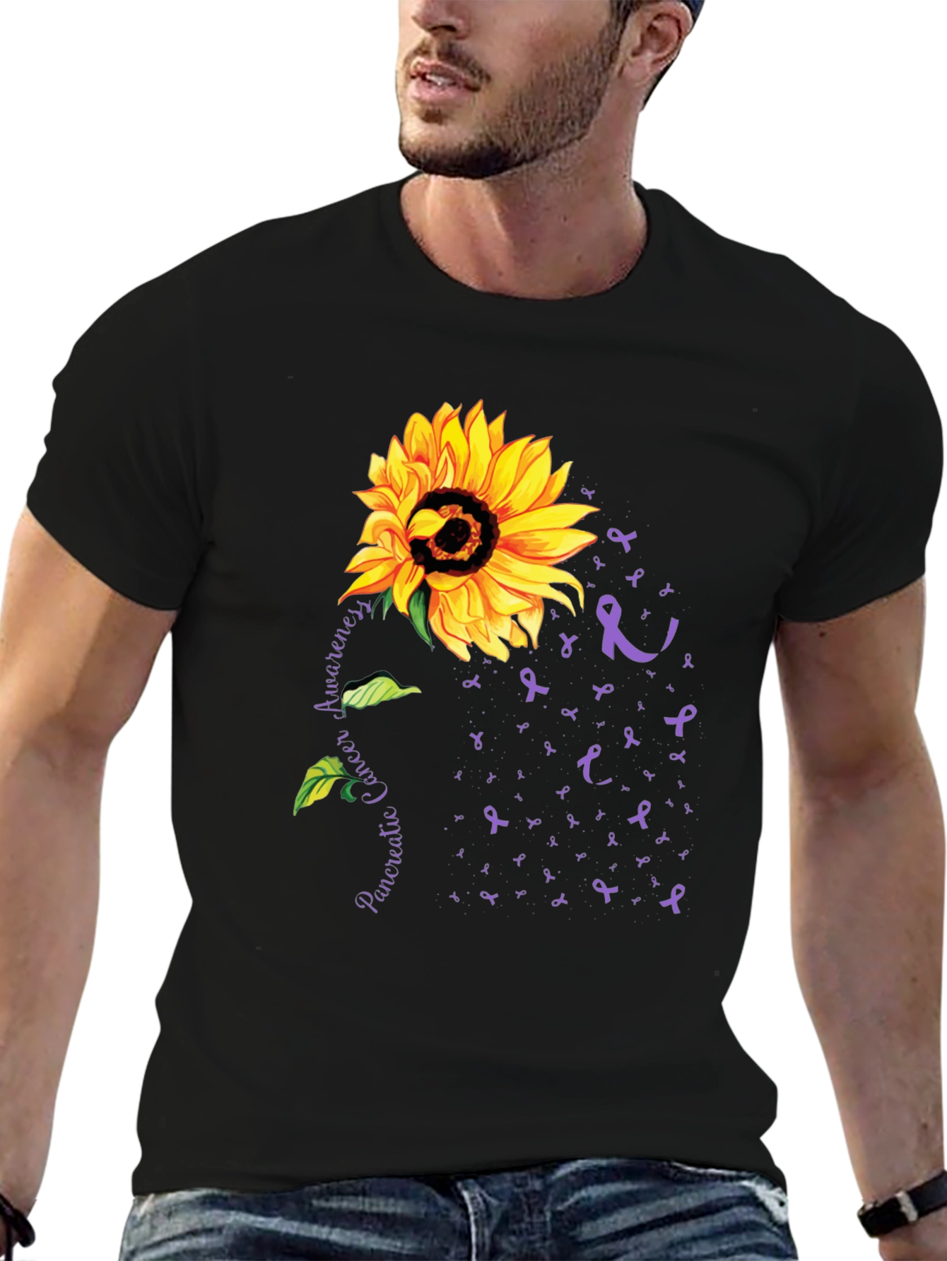 Show your support with this meaningful black t-shirt. It features a vibrant sunflower design accompanied by purple pancreatic cancer awareness ribbons, creating a powerful visual statement. The words "Pancreatic Cancer Awareness" elegantly intertwine with the floral design. Made from a comfortable-looking fabric, this t-shirt is perfect for raising awareness at events, walks, or for everyday wear. Support the cause in style with this impactful and eye-catching t-shirt.
