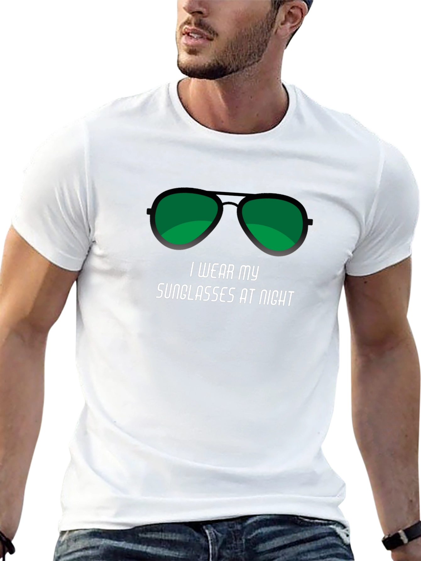 Rock this cool, black graphic tee featuring a bold pair of aviator sunglasses and the playful phrase 'I wear my sunglasses at night.' Made from a soft, comfortable fabric, this t-shirt is perfect for casual wear. Show off your fun-loving personality and stand out from the crowd. The unique design makes it a great conversation starter and a must-have addition to any wardrobe. This tee is ideal for concerts, parties, or just hanging out with friends. Get yours today and embrace your quirky side!