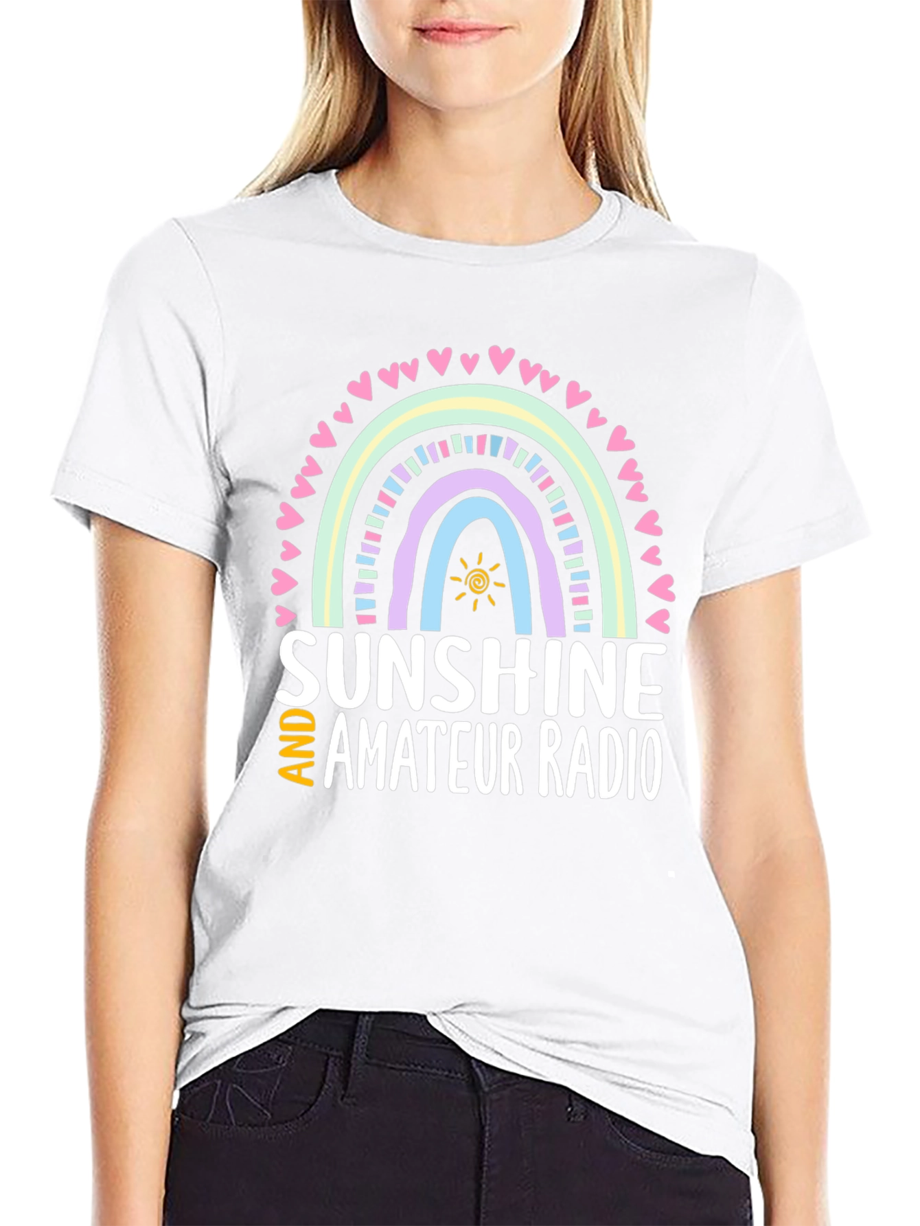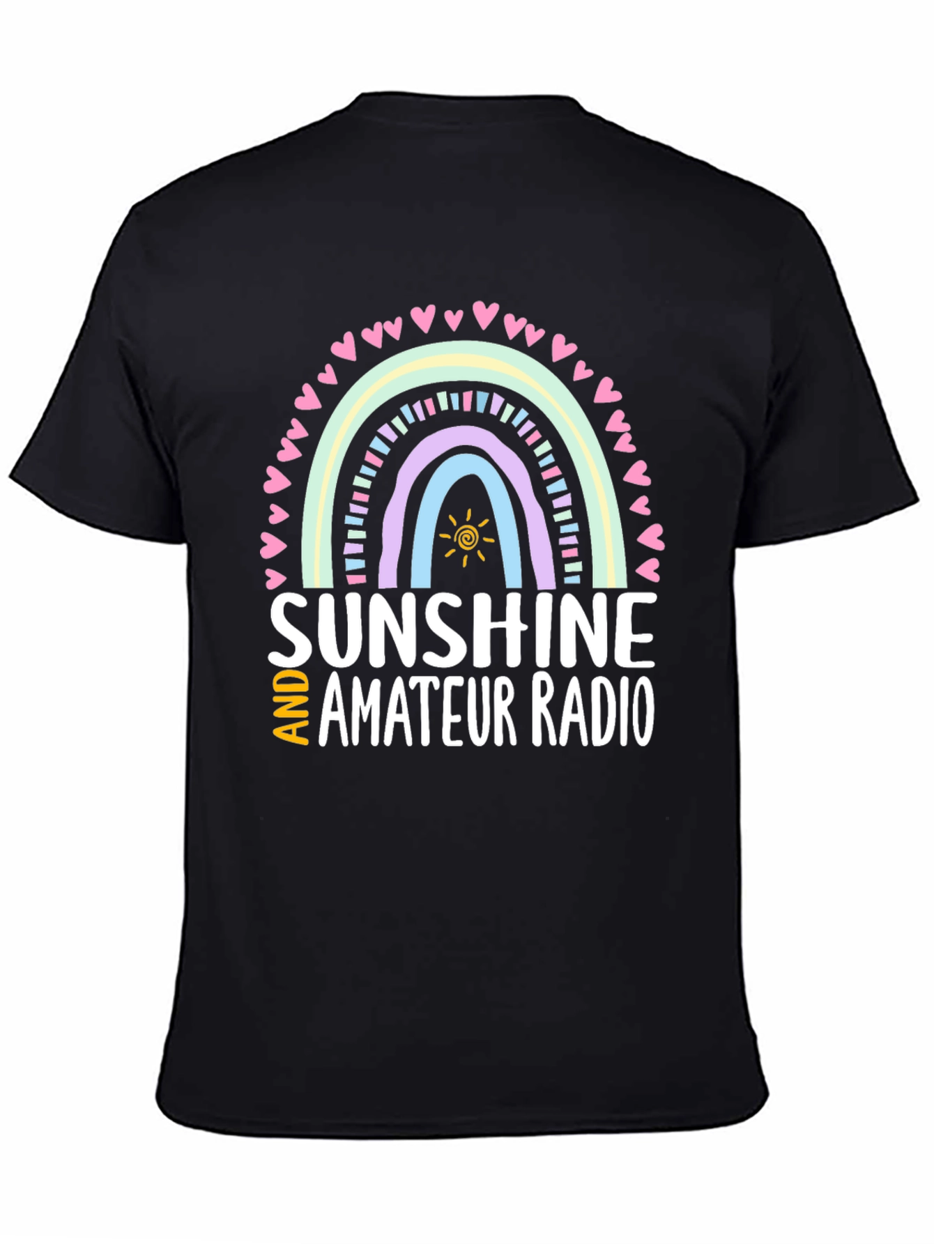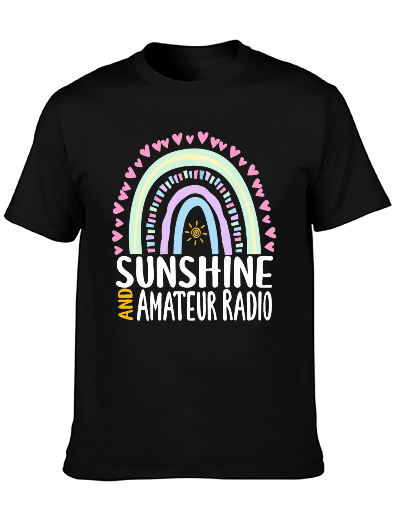 Radiate positivity with this stylish black graphic tee! Featuring a vibrant, pastel-colored rainbow design adorned with hearts, a cute sun graphic, and the words 'Sunshine and Amateur Radio,' this shirt is perfect for ham radio enthusiasts. Made from what appears to be a comfortable, soft fabric, this tee will keep you feeling good all day long. Wear it to your next radio club meeting, casual outings, or anywhere you want to spread some cheerful vibes. Stand out with this unique and eye-catching piece!