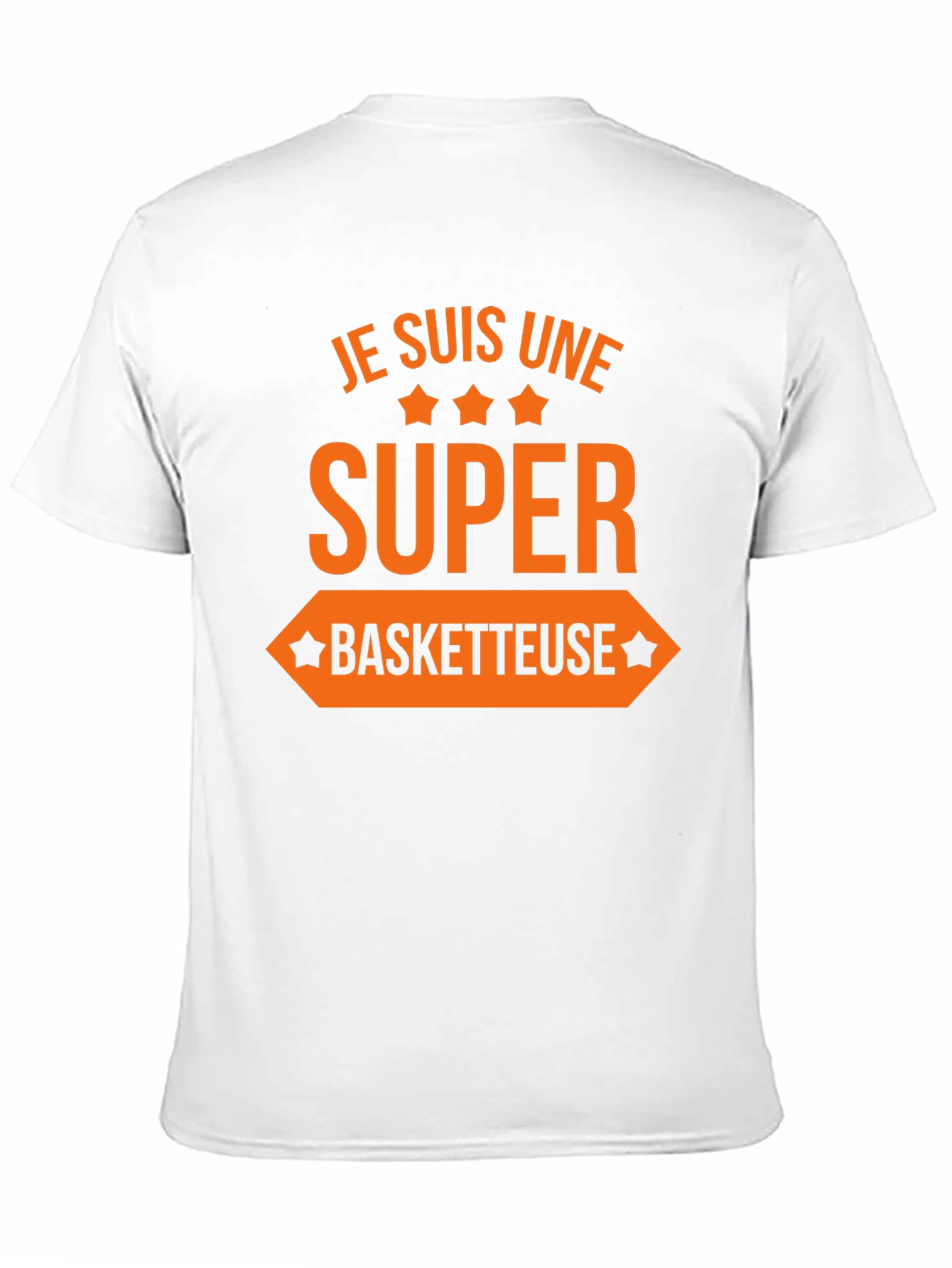 Show off your love for basketball with this stylish black t-shirt. The shirt features the phrase "Je suis une Super Basketteuse" in bold orange lettering, making a statement that is both fun and empowering. Made from a comfortable material, this tee is perfect for wearing on the court, at the gym, or as casual wear. The design includes star accents and a unique arrow shape emphasizing the word 'Basketteuse'. It's a great gift for the basketball-loving woman in your life. Get yours now and showcase your super skills!