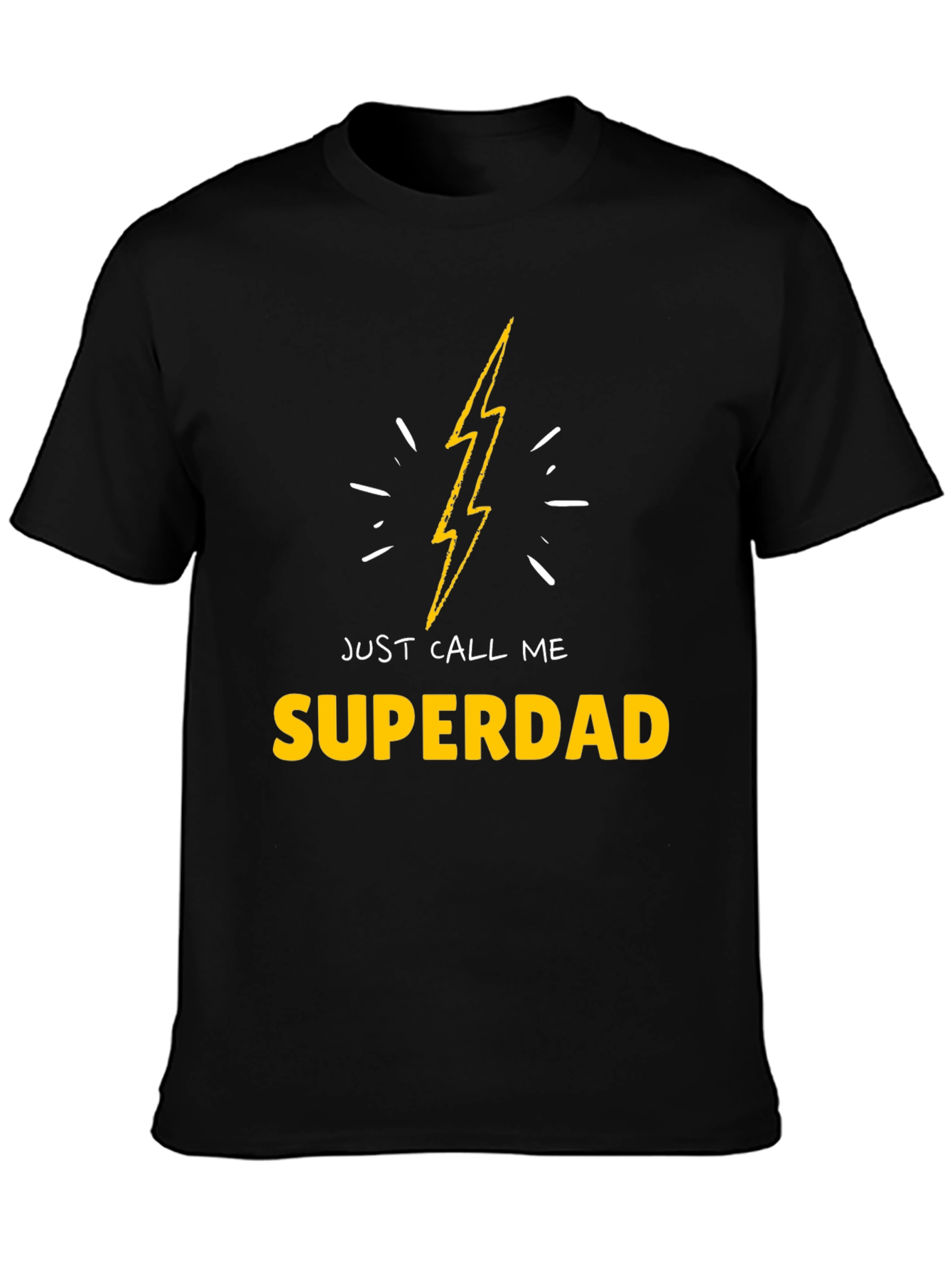 Show off your super powers as a dad with this stylish black t-shirt. Featuring a bold yellow lightning bolt graphic and the words "JUST CALL ME SUPERDAD," this shirt is perfect for everyday wear. Made from a comfortable-looking fabric, it offers both style and ease. Ideal for casual outings, family gatherings, or just relaxing at home. Let everyone know you're the superdad in charge!