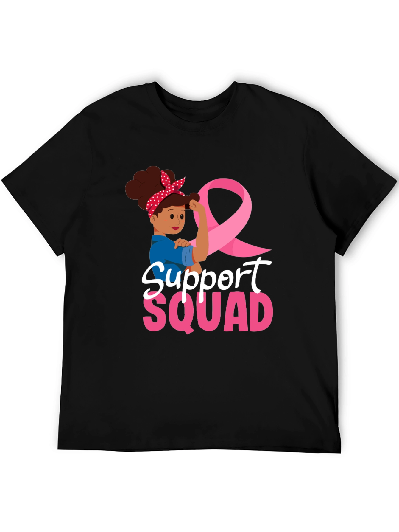 Show your support with this powerful black T-shirt. Featuring a unique design of a strong woman flexing her bicep next to a pink breast cancer awareness ribbon and the words "Support Squad" in a bold, eye-catching font. This shirt is perfect for walks, events or simply showing your solidarity and raising awareness for breast cancer. Made with comfortable, breathable fabric, it's an ideal addition to any supporter's wardrobe.