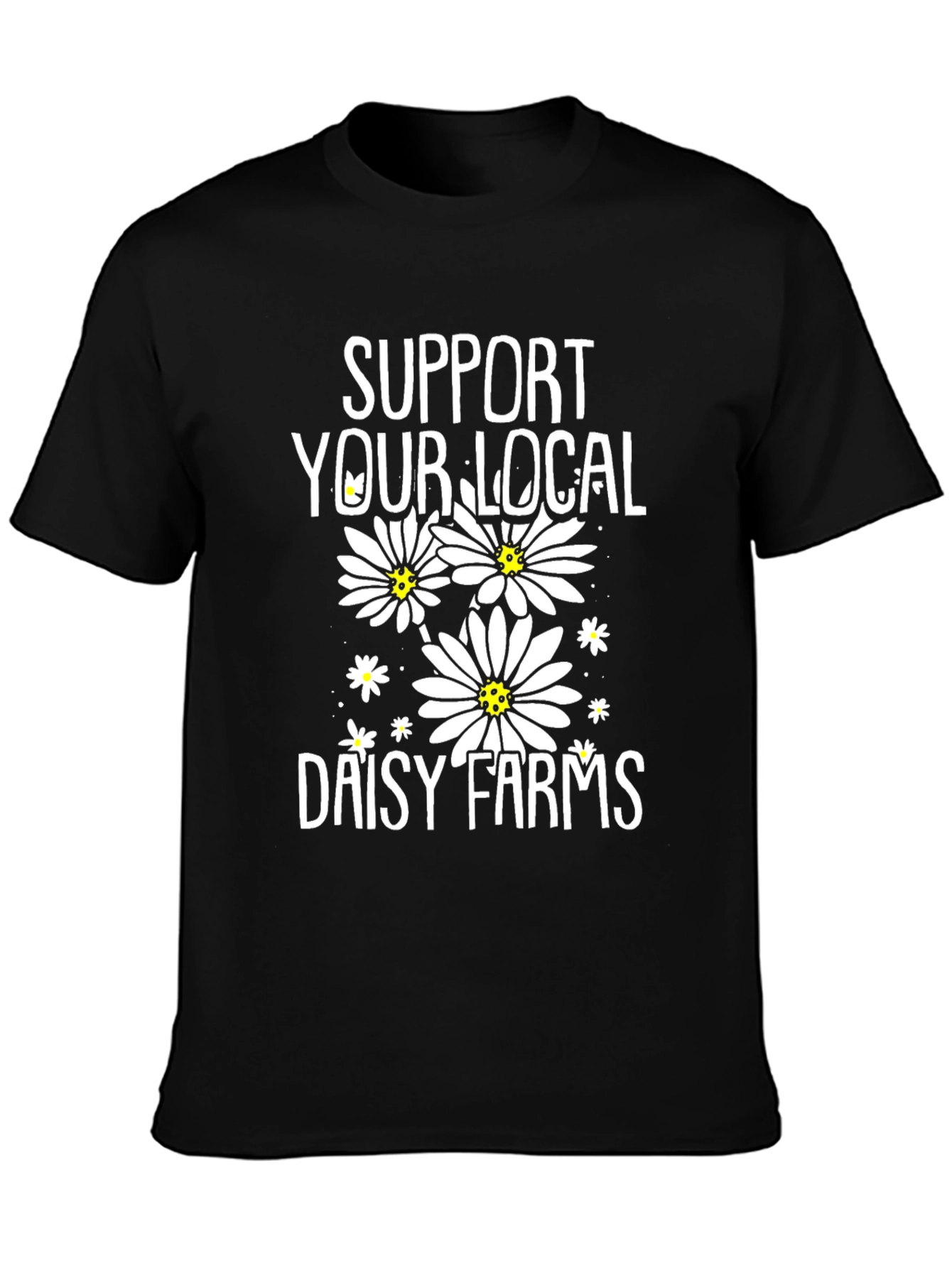 Show your love for local agriculture with this stylish black T-shirt. Featuring a bold white print that reads "Support Your Local Daisy Farms," this tee is adorned with charming daisy illustrations. Made from a comfortable fabric, it's perfect for casual wear, farm visits, or as a thoughtful gift for garden enthusiasts. Whether you're at the farmers market or just out and about, this shirt will let you proudly support sustainable local farming.
