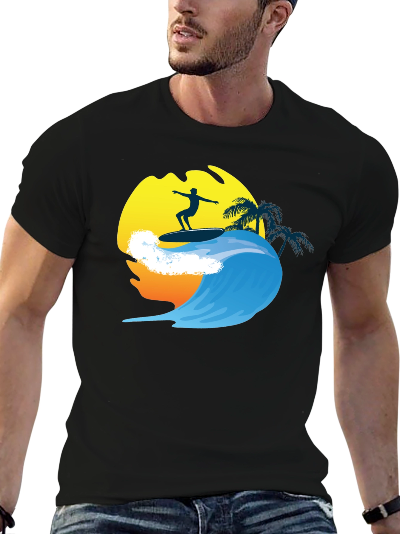 Embrace the summer spirit with this stylish black graphic tee. Featuring a vibrant design of a surfer riding a wave against a backdrop of a sunny beach and palm trees, this t-shirt captures the essence of a tropical getaway. The eye-catching colors and dynamic imagery make it a standout piece for casual wear. Made from what appears to be soft and breathable fabric, this tee promises comfort and style. Perfect for beach outings, summer parties, or simply adding a touch of vacation vibes to your everyday wardrobe. Get ready to ride the wave of fashion!