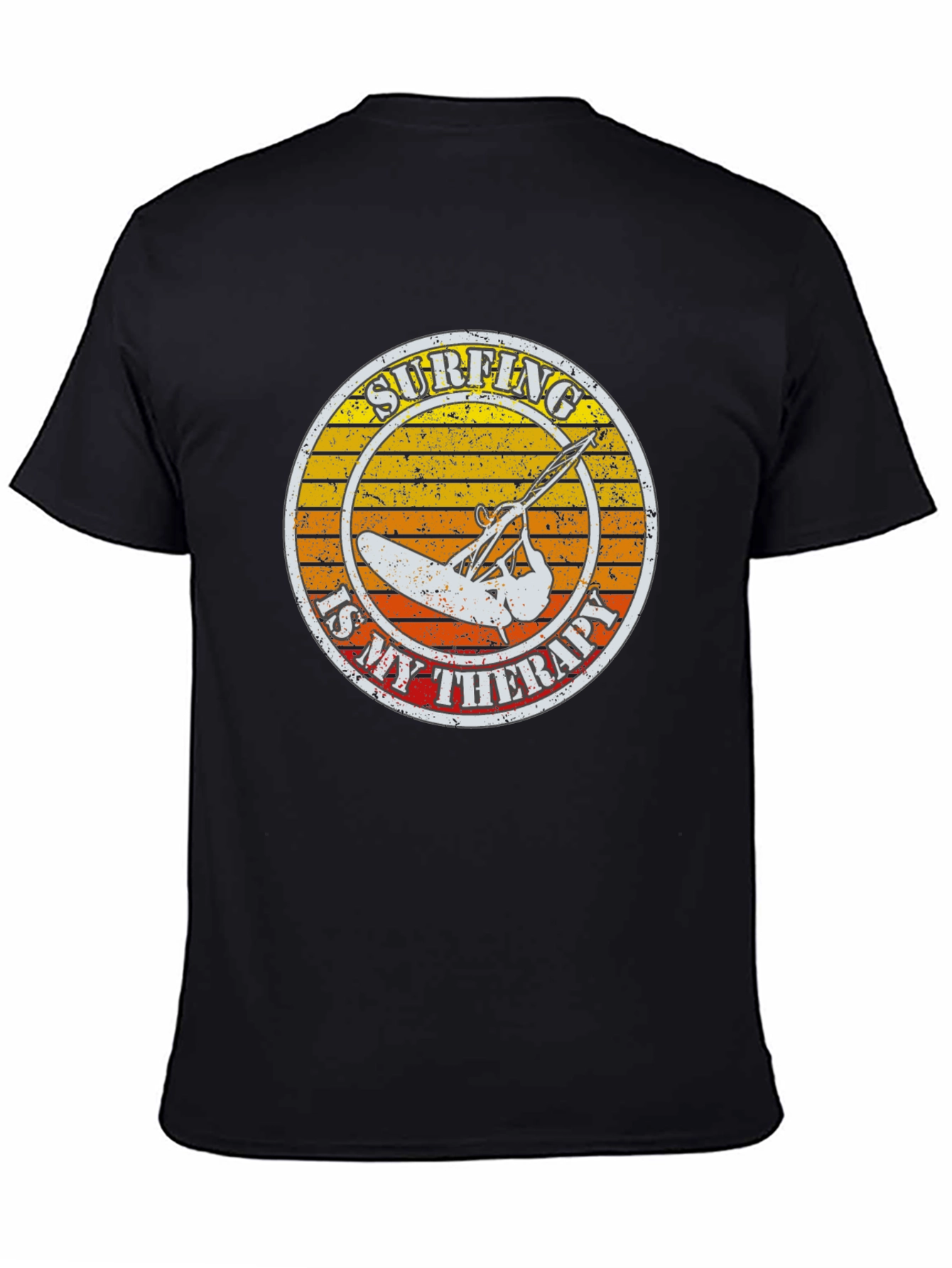 Embrace your love for surfing with this stylish and comfortable black t-shirt. The tee features a unique graphic print with a vintage-inspired circular design. The artwork displays a windsurfer silhouetted against a sunset backdrop, encircled by the words "Surfing is My Therapy." Crafted from a soft, breathable fabric, this shirt is perfect for everyday wear or your next beach outing. It's a great way to express your passion for surfing and showcase your laid-back lifestyle. Get yours today and let the world know that surfing is more than just a hobby, it's your therapy.