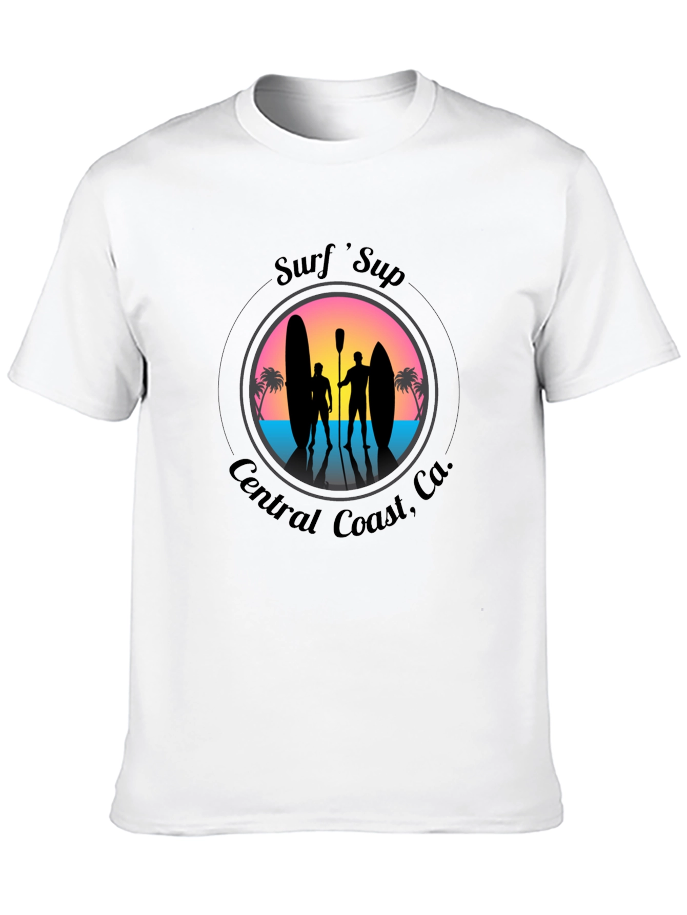 Embrace the surf culture with this stylish black graphic tee. The design features a vibrant sunset backdrop with palm trees, silhouettes of surfers with paddleboards, and the words "Surf 'Sup Central Coast, CA" encircling the image. This eye-catching tee is perfect for casual wear, beach outings, or anyone who loves the coastal lifestyle. Made from comfortable material, this shirt is sure to be a favorite in your wardrobe. Show off your love for surfing and the Central Coast with this unique and trendy tee.