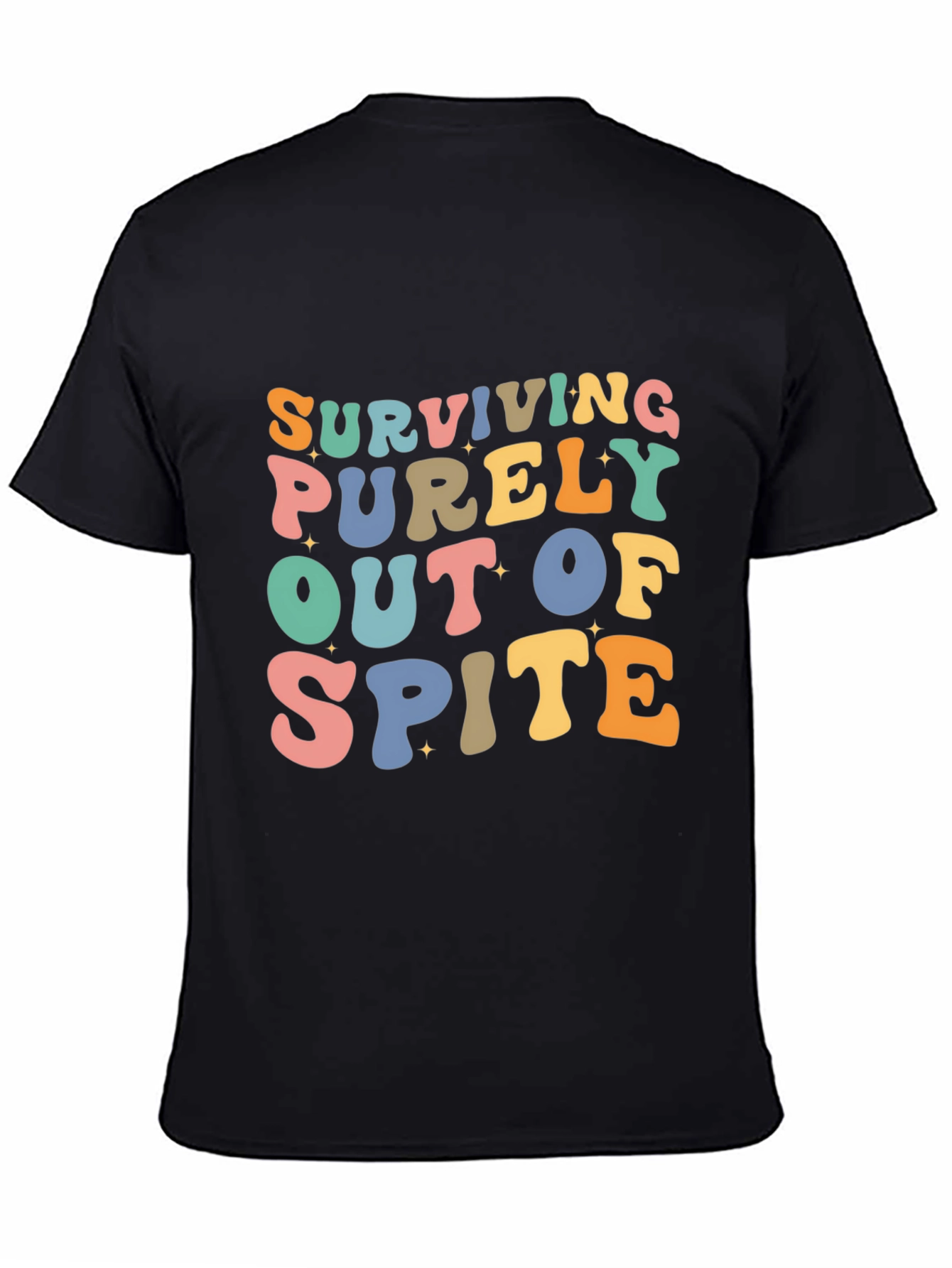 Express your defiant spirit with this eye-catching black t-shirt! Featuring a bold, retro-inspired design that reads "Surviving Purely Out of Spite" in playful, multi-colored lettering, this tee is sure to turn heads. The soft, comfortable fabric makes it perfect for everyday wear. Showcase your sassy personality and make a statement wherever you go. Ideal for casual outings, social gatherings, or just lounging around, this tee is a must-have for those who live life on their own terms. Grab yours today and let the world know you're thriving, despite it all!
