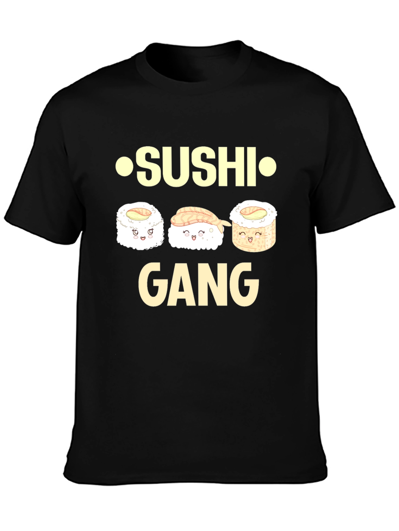 This fun black t-shirt features a playful cartoon-style design of sushi characters with the words "SUSHI GANG" printed above and below. The cute sushi illustrations add a whimsical touch, making it perfect for sushi lovers and anyone with a sense of humor. Made from a comfortable fabric, this tee is ideal for casual wear, sushi outings, or as a unique gift for friends and family who appreciate Japanese cuisine and kawaii-style graphics. Its classic fit ensures a relaxed and stylish look for any occasion. Show off your love for sushi with this eye-catching and adorable t-shirt!
