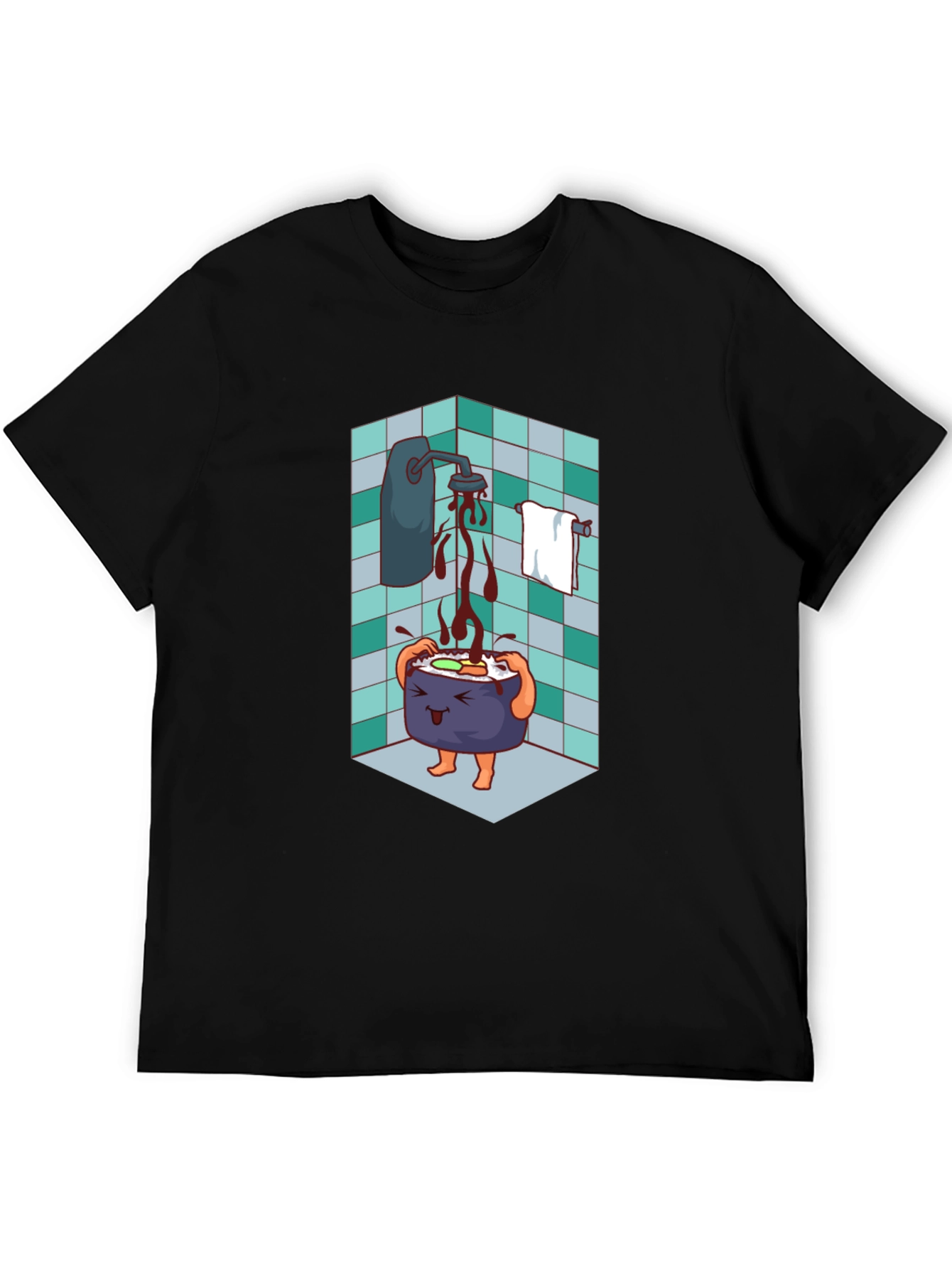 This unique t-shirt features a playful cartoon design of a sushi roll taking a shower in a tiled bathroom. The quirky graphic showcases a sushi character under a showerhead with soy sauce pouring down, creating a humorous and eye-catching look. Made from a comfortable, dark-colored fabric, this tee is perfect for sushi lovers and those with a fun sense of style. It's a great conversation starter and a standout piece for casual wear. This tee makes a perfect gift for foodies, anime enthusiasts, or anyone who appreciates quirky humor. Wear it to restaurants, comic cons, or just relaxing at home.
