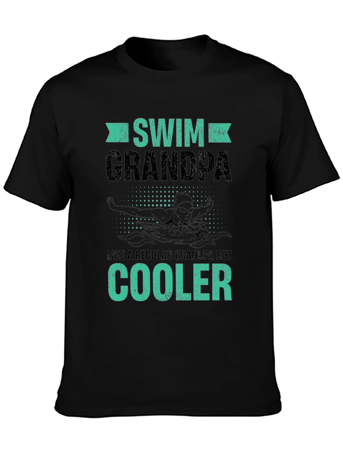 This stylish black t-shirt features a playful graphic design, perfect for the swimming enthusiast grandpa! The design includes the words "SWIM" and "GRANDPA" in bold text, complemented by an image of a swimmer gliding through water. Below the swimmer, the text reads "LIKE A REGULAR GRANDPA BUT COOLER," adding a touch of humor. Crafted from comfortable, breathable fabric, this tee is ideal for casual wear, workouts, or simply showing off grandpa's love for swimming. It's a unique and thoughtful gift that's sure to make any swim-loving grandpa smile. The turquoise and black contrasts beautifully for a great looking shirt.