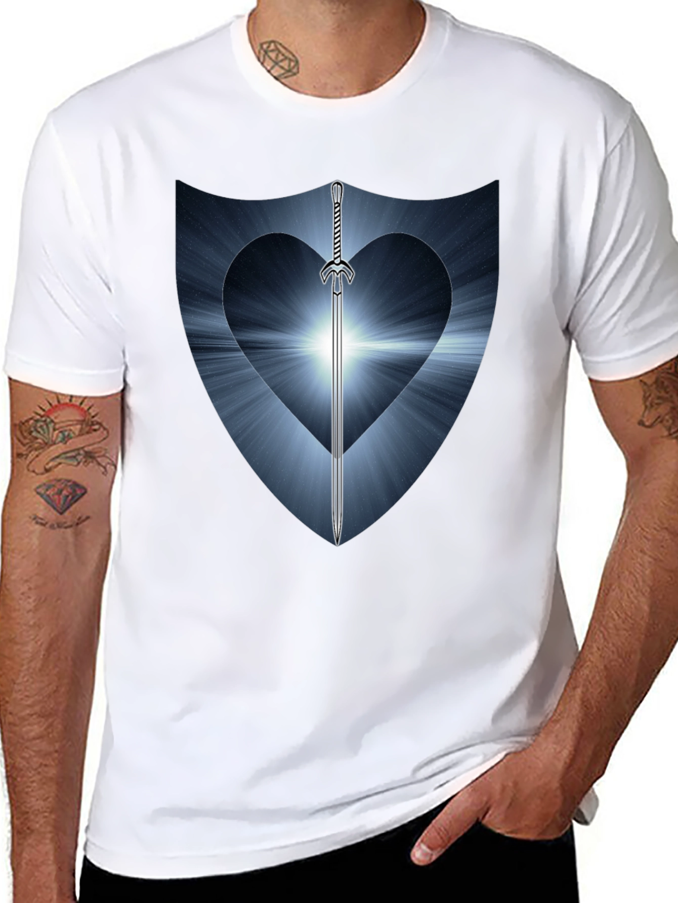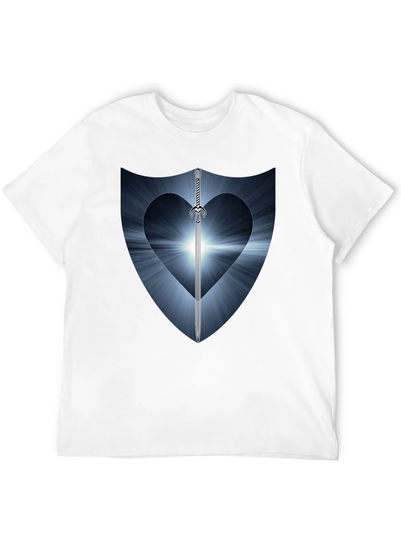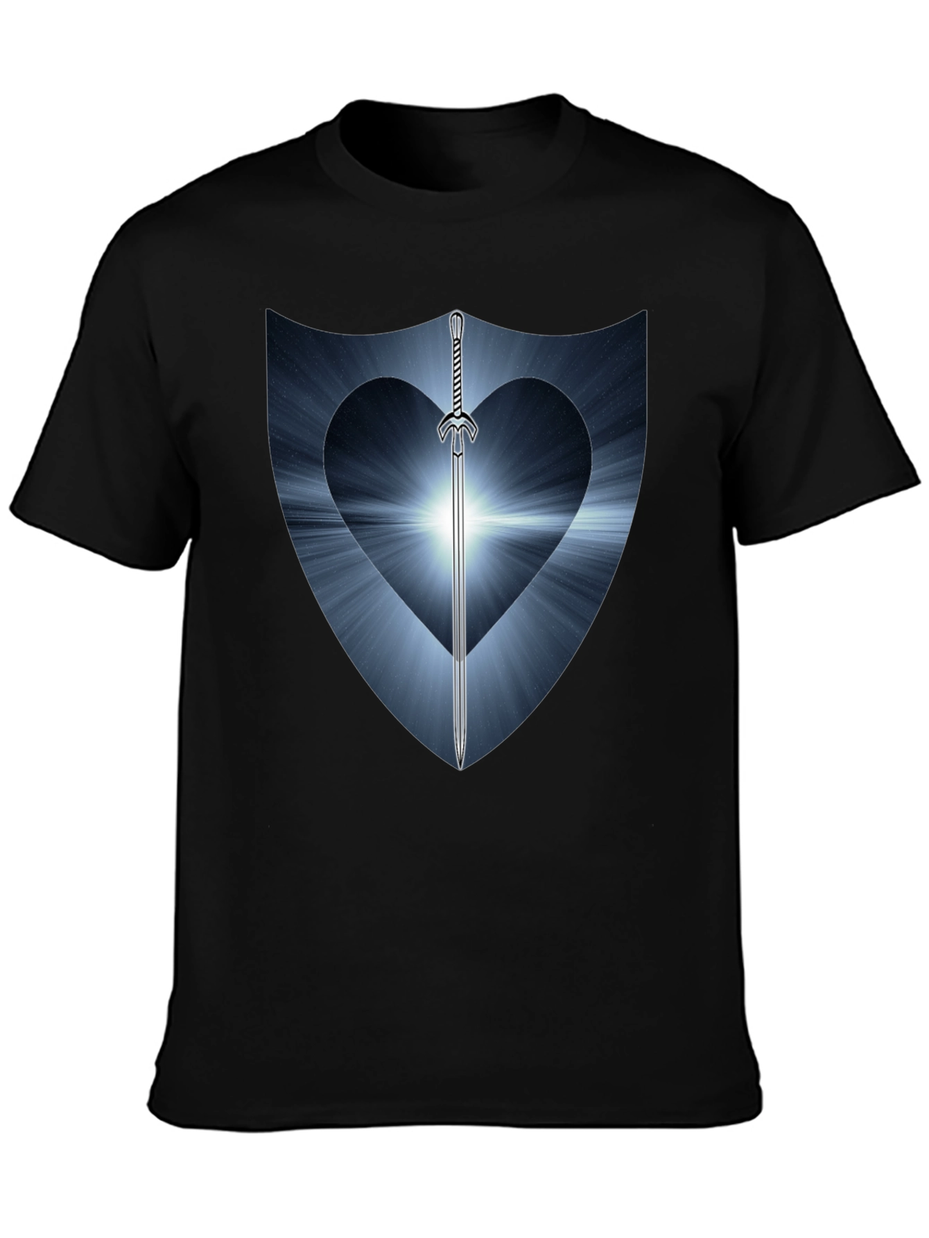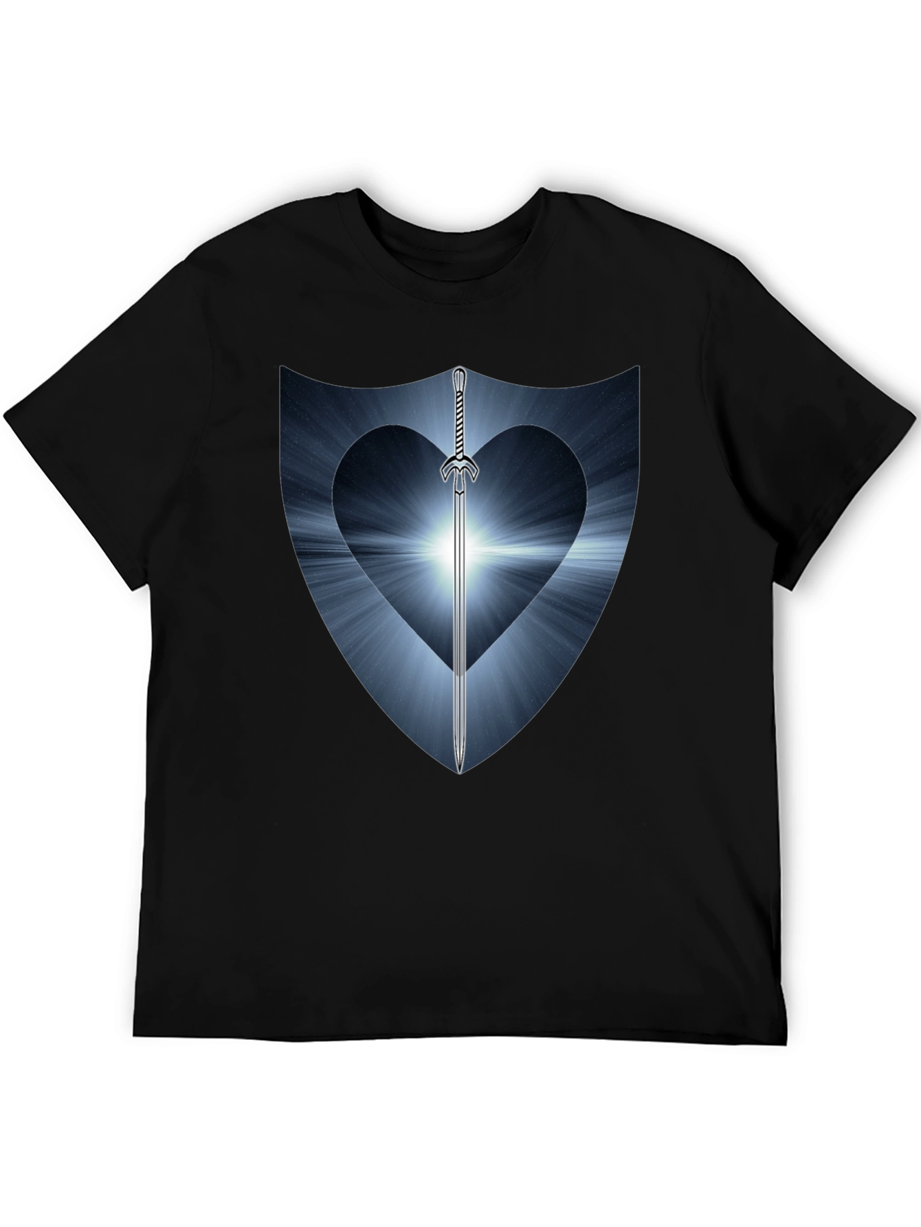Showcase your warrior spirit with this unique black graphic tee. Featuring a striking shield design with a heart-shaped cutout and a gleaming sword piercing through, it's a bold statement piece. The design has light blue tones emanating from the heart in rays. Made from comfortable, breathable cotton, this shirt is perfect for everyday wear. Pair it with jeans or shorts for a casual, yet stylish look. Express your individuality and stand out from the crowd with this eye-catching design. Great for fantasy lovers, gamers, and anyone with a strong sense of self!