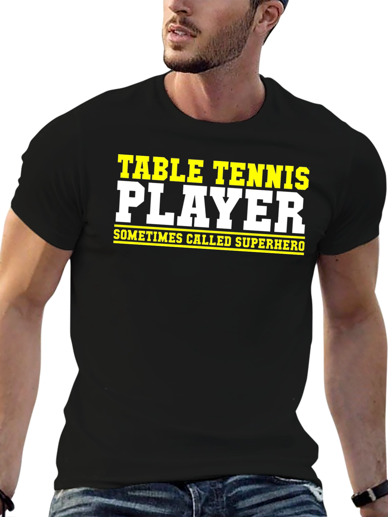 Show off your love for table tennis with this stylish graphic tee. The black shirt features bold lettering that reads "TABLE TENNIS PLAYER," with the phrase "SOMETIMES CALLED SUPERHERO" underneath. Made from a comfortable, breathable fabric, this t-shirt is perfect for casual wear, workouts, or showing your passion for the sport at your next ping pong match. This shirt makes a great gift for the table tennis enthusiast in your life.