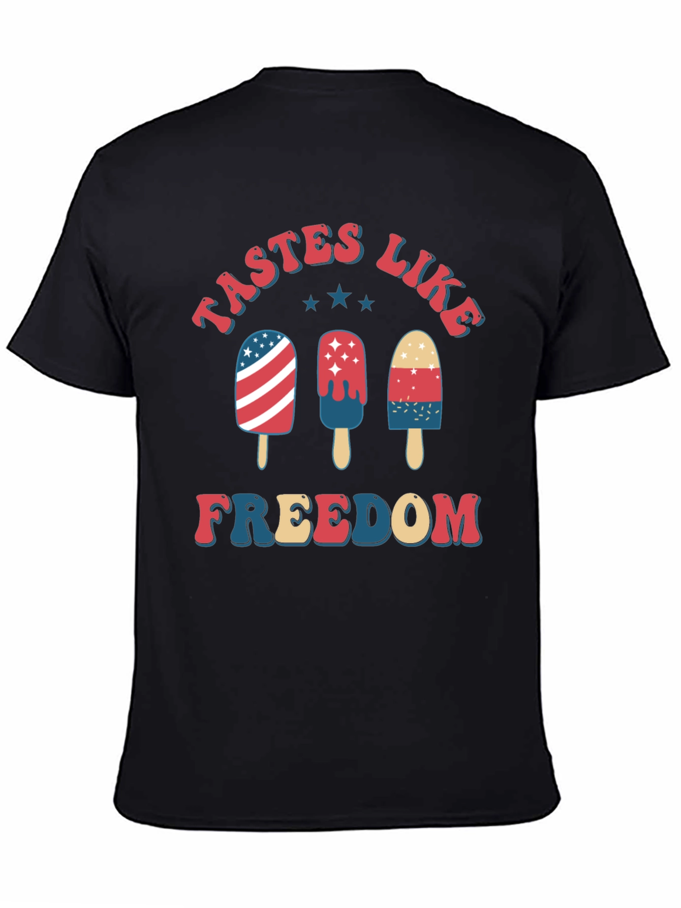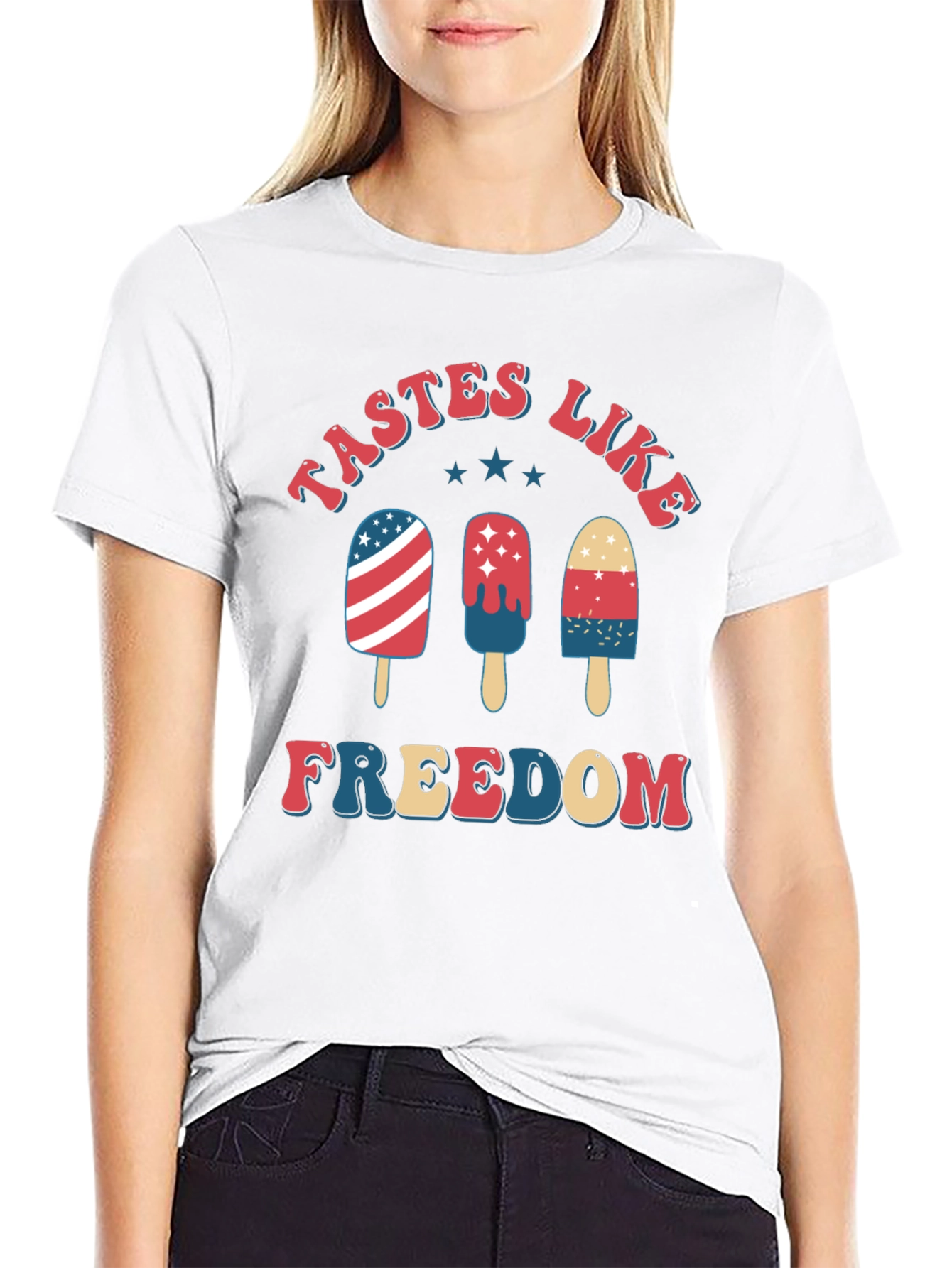 Show your love for America with this stylish and fun graphic t-shirt. Featuring a vintage-inspired design with 'Tastes Like Freedom' text and patriotic popsicle graphics, this shirt is perfect for celebrating Independence Day, Memorial Day, or any day you want to show off your American pride. Made from comfortable, breathable fabric, this tee is ideal for casual wear. Pair it with jeans, shorts, or a skirt for a relaxed and festive look. The vibrant colors and playful design make it a standout piece in any wardrobe. Get yours today and celebrate freedom in style!