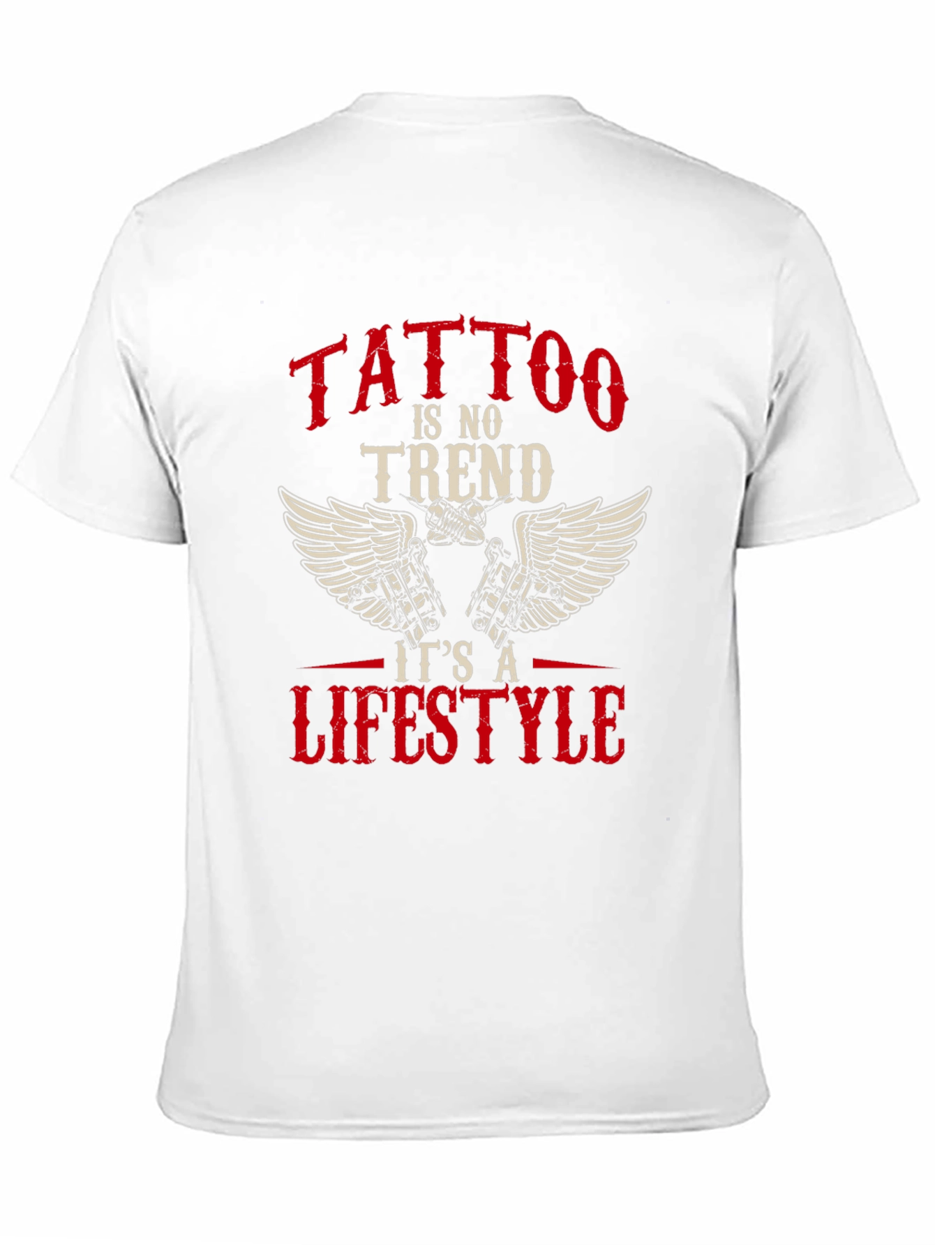Show off your passion with this striking black t-shirt. It features a bold graphic design with the words "Tattoo is no trend, it's a lifestyle" in a vintage-inspired red font. The design also incorporates intricate winged piston illustrations. Made from a soft, comfortable fabric, this shirt is perfect for everyday wear. Whether you're a tattoo enthusiast or simply appreciate unique graphic tees, this shirt is sure to make a statement. Ideal for casual outings, tattoo conventions, or just expressing your individuality. Available in various sizes. Get yours today!