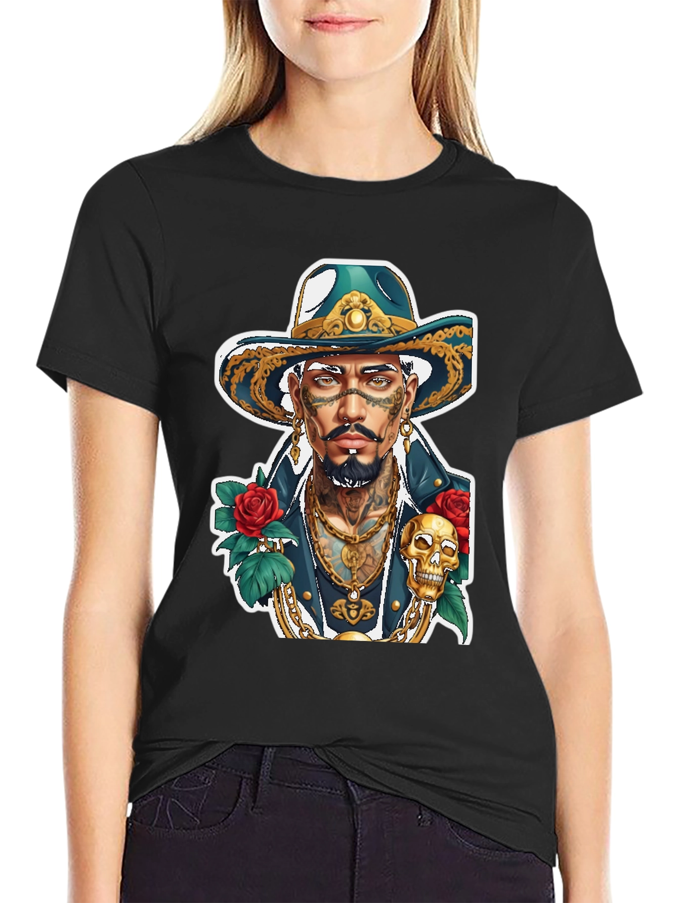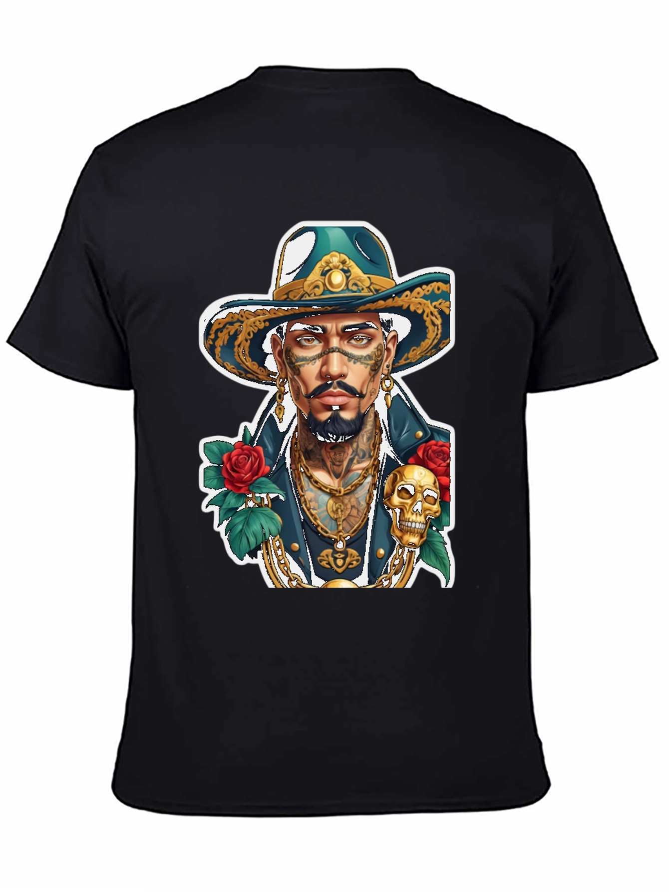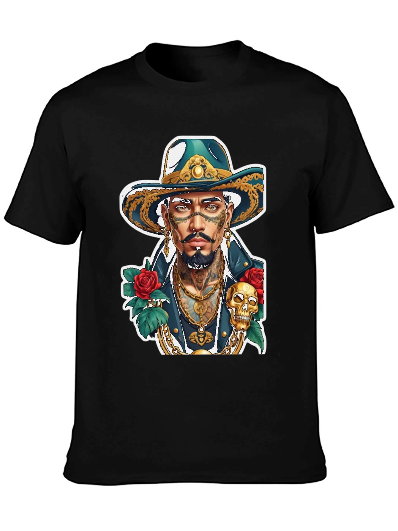 Show off your unique style with this eye-catching graphic t-shirt. This black tee features a vibrant and detailed illustration of a tattooed man wearing a stylish hat, adorned with intricate gold details and surrounded by roses and a skull. The design exudes confidence and boldness. Made from a comfortable fabric, this shirt is perfect for everyday wear, concerts, or casual outings. It's a great conversation starter and a way to express your individuality. Get yours now and make a statement!