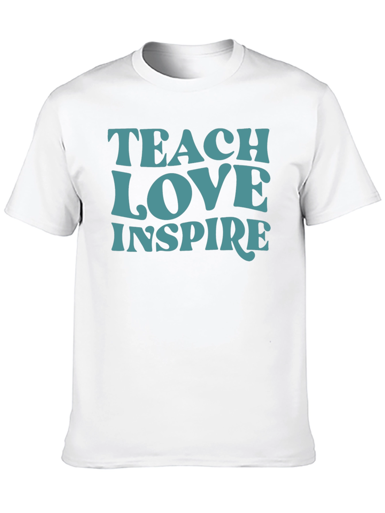 This black t-shirt features a bold, eye-catching graphic design. The words "TEACH", "LOVE", and "INSPIRE" are stacked vertically in a teal, rounded font, giving the design a playful and inviting look. This tee is perfect for educators, mentors, or anyone who wants to spread positivity and encouragement. Made from a comfortable-looking fabric, this t-shirt is ideal for everyday wear, casual outings, or as a statement piece to express your values. Show the world what you stand for with this inspiring and stylish tee. Available in various sizes.