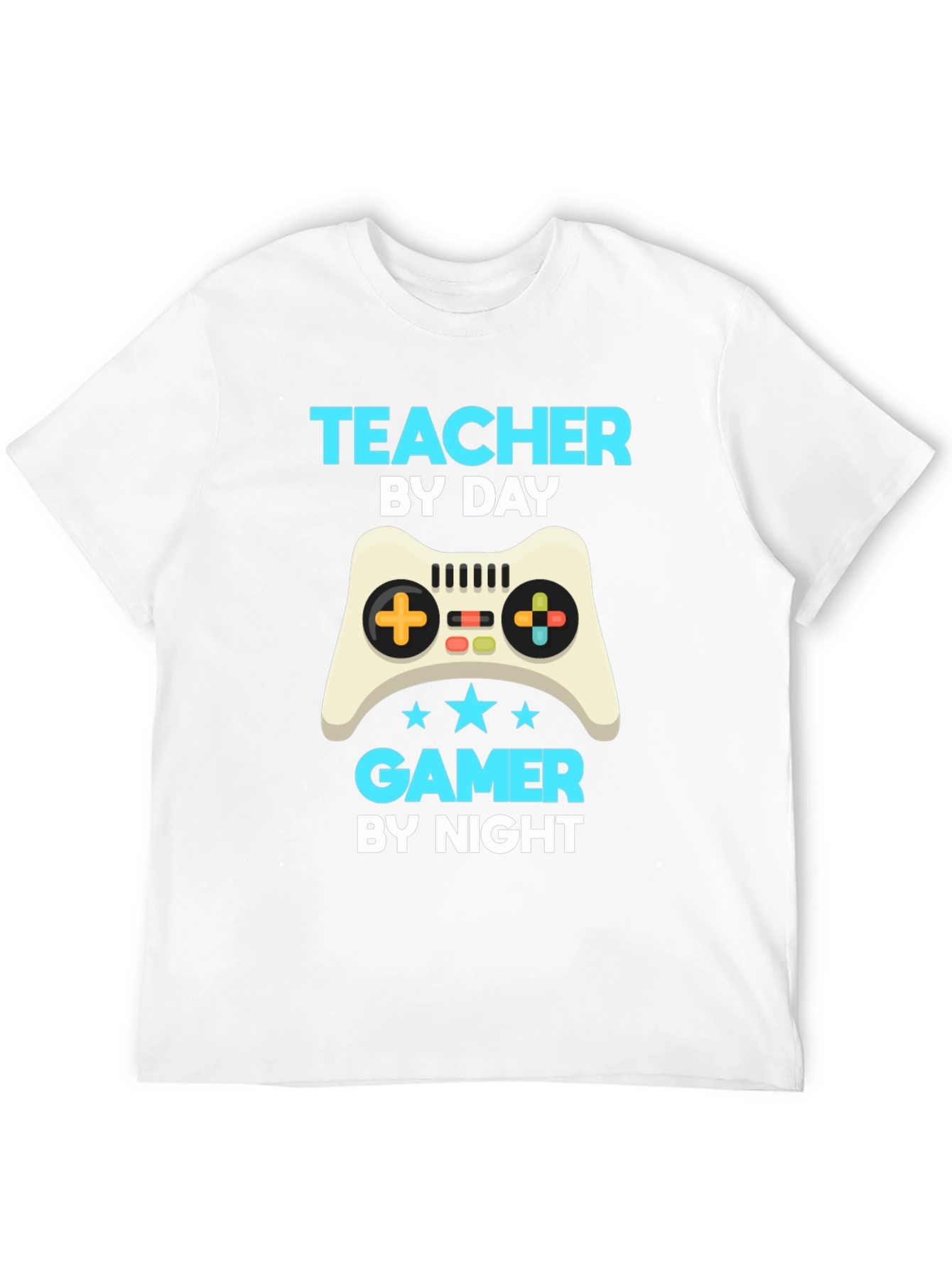 Show off your dual passion with this unique black t-shirt featuring a fun and relatable design. The shirt proudly displays the phrase "Teacher by Day Gamer by Night" above and below a retro-style gaming controller graphic. The controller is accented with colorful buttons and stars, adding a playful touch. Made from comfortable and breathable fabric, this t-shirt is perfect for casual wear, gaming sessions, or a fun way to express yourself at school or work. The bold print ensures you'll stand out while showcasing your love for both teaching and gaming. A great conversation starter and a must-have for any teacher who loves to game!