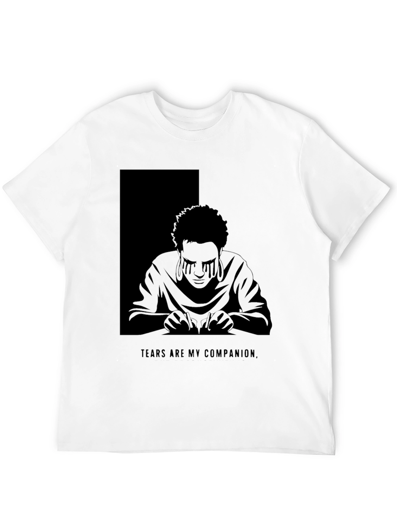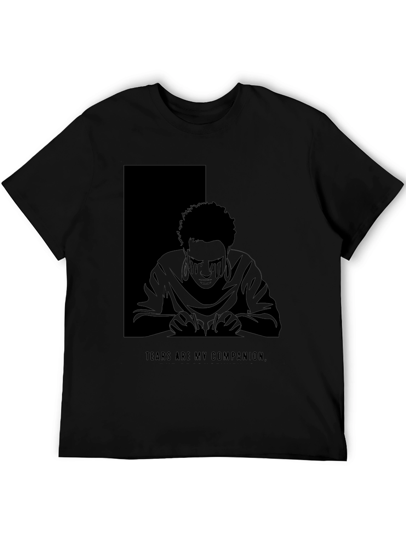 Embrace the shadows with this unique black graphic t-shirt. Featuring a striking illustration of a person with tears streaming down their face, set against a contrasting background, this tee makes a bold statement. The phrase "Tears Are My Companion" adds a touch of introspection. Crafted from comfortable, breathable fabric, it's perfect for everyday wear or making a statement at your next gathering. Express your individuality and stand out from the crowd with this eye-catching design. Wear it casually with jeans, or dress it up with a jacket for a night out. Perfect for those who appreciate darker aesthetics or introspective themes.