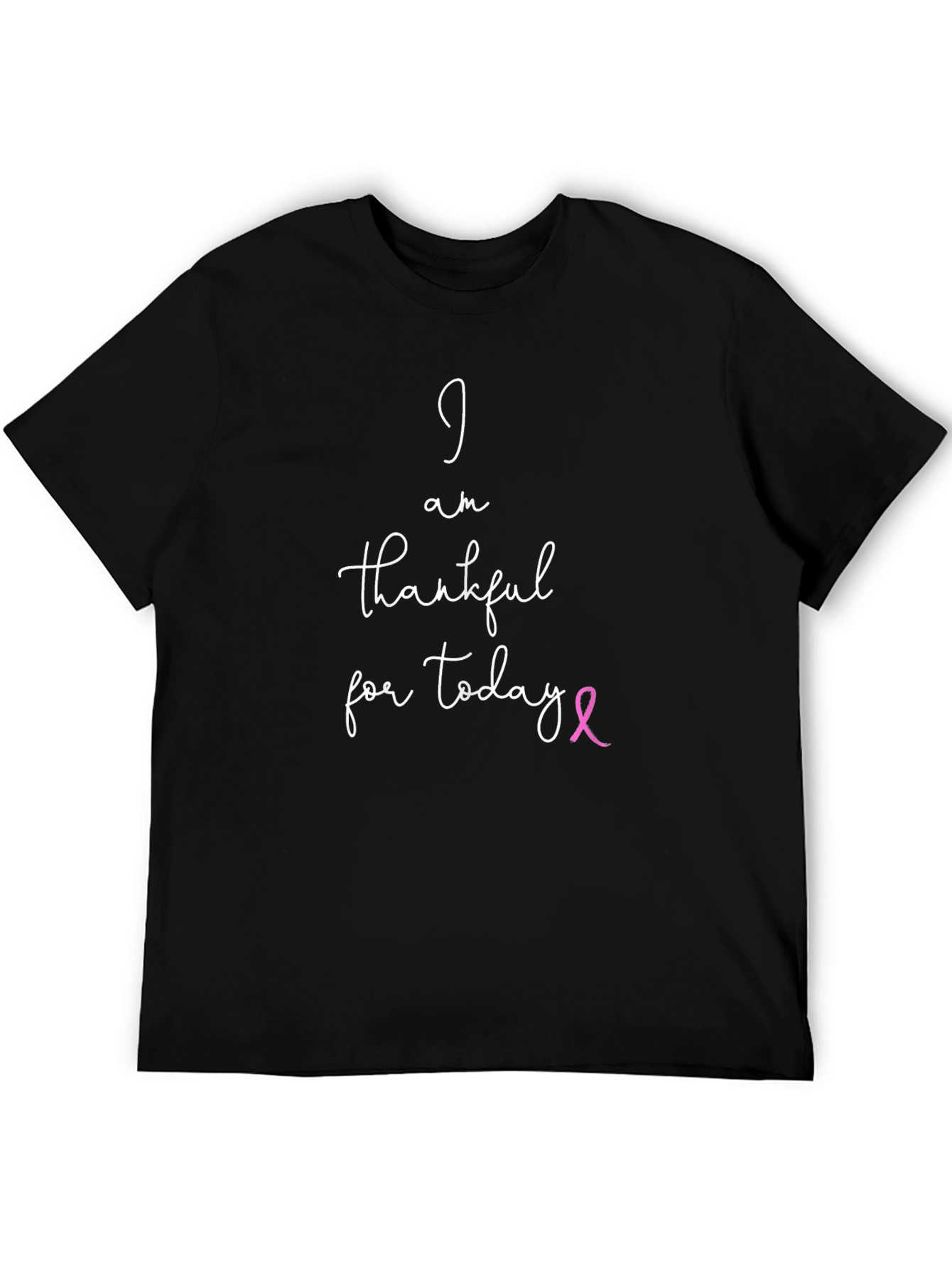 Express gratitude with this stylish black t-shirt. The design features the words "I am thankful for today" in a delicate script font, complemented by a pink breast cancer awareness ribbon. This tee is perfect for showing support and spreading positivity. Crafted from a soft, comfortable fabric, it's ideal for everyday wear. Whether you're running errands, attending a charity event, or simply relaxing at home, this t-shirt is a meaningful and fashionable choice. Makes a thoughtful gift for loved ones and supporters of breast cancer awareness.
