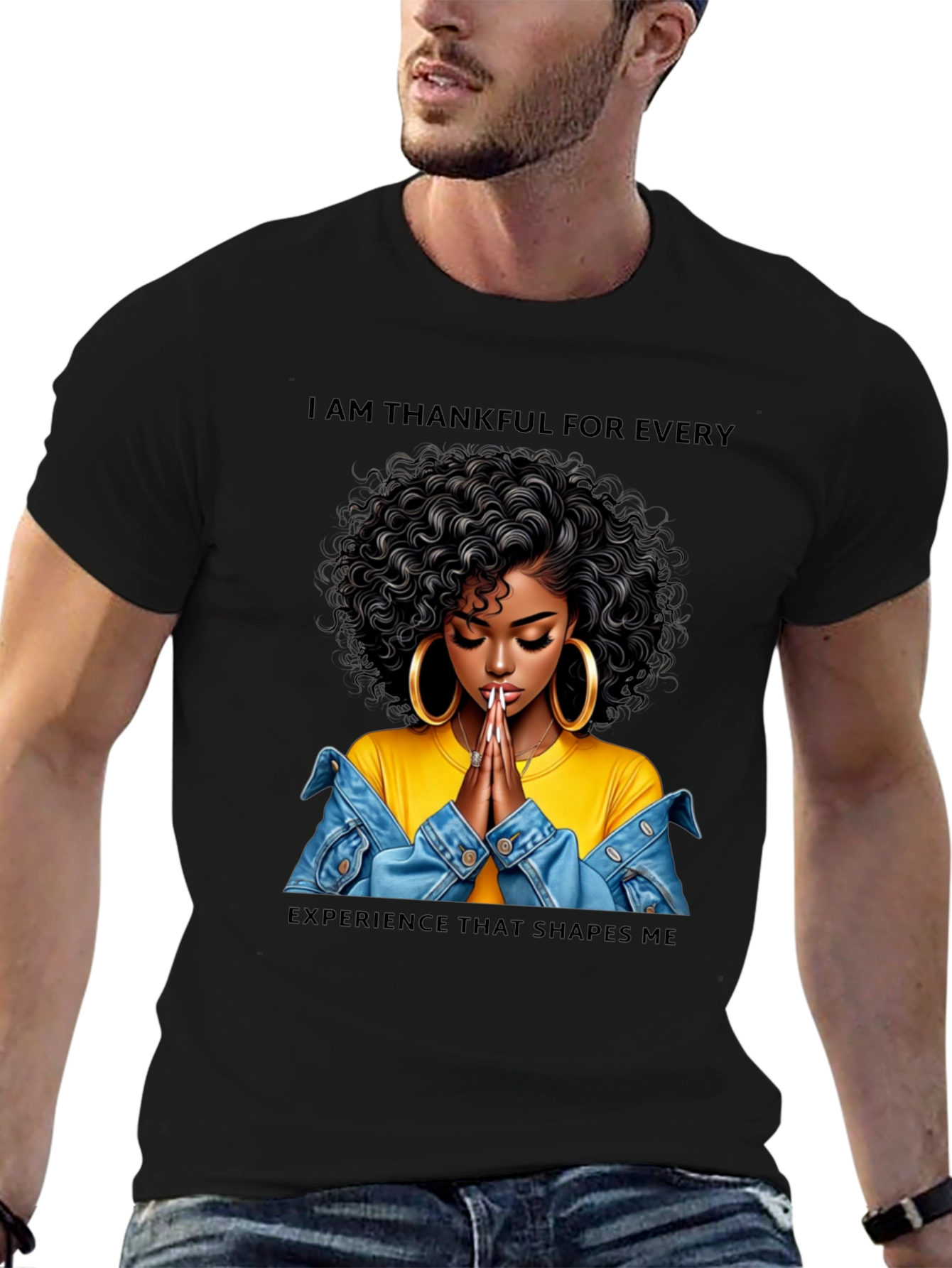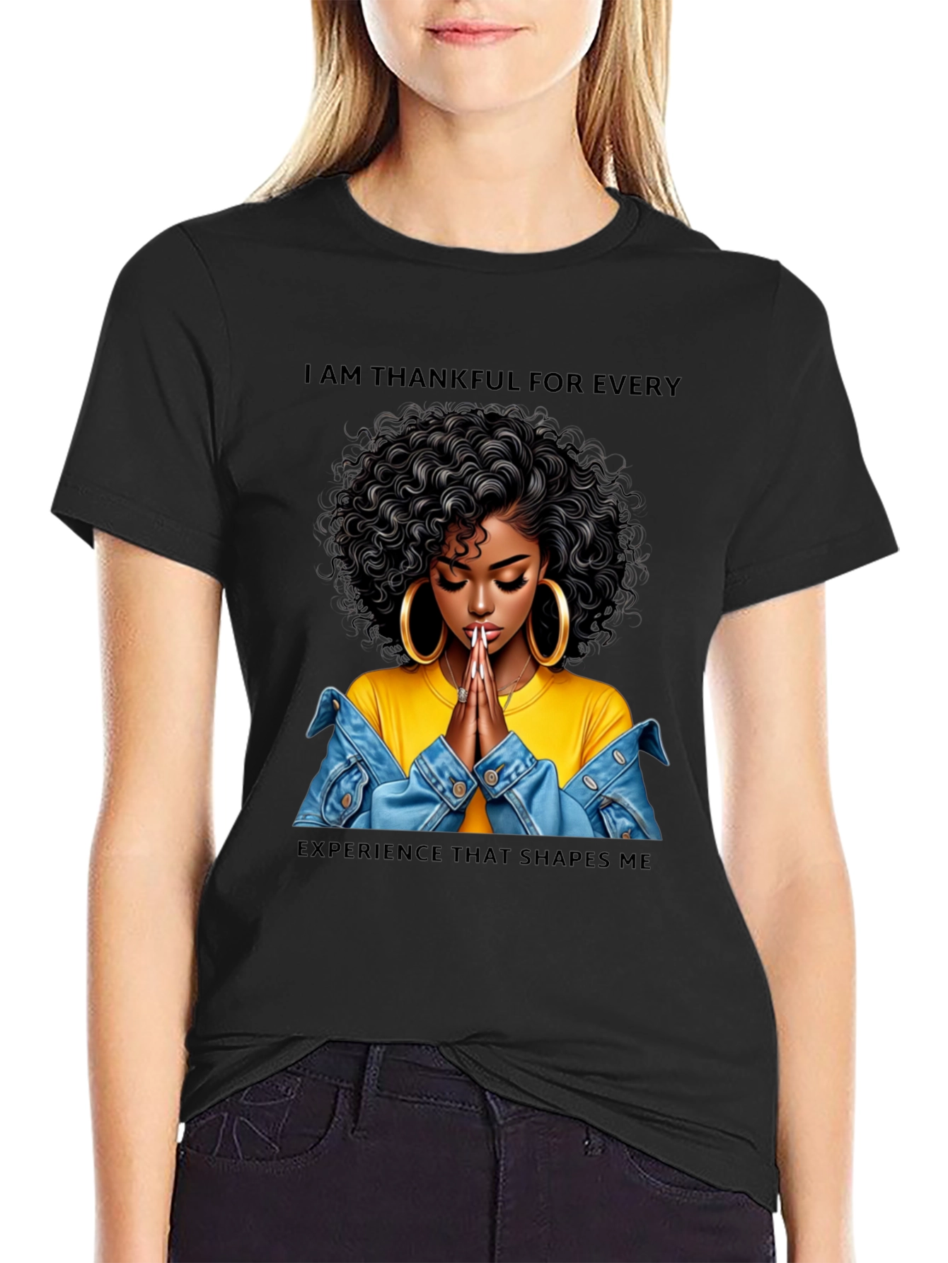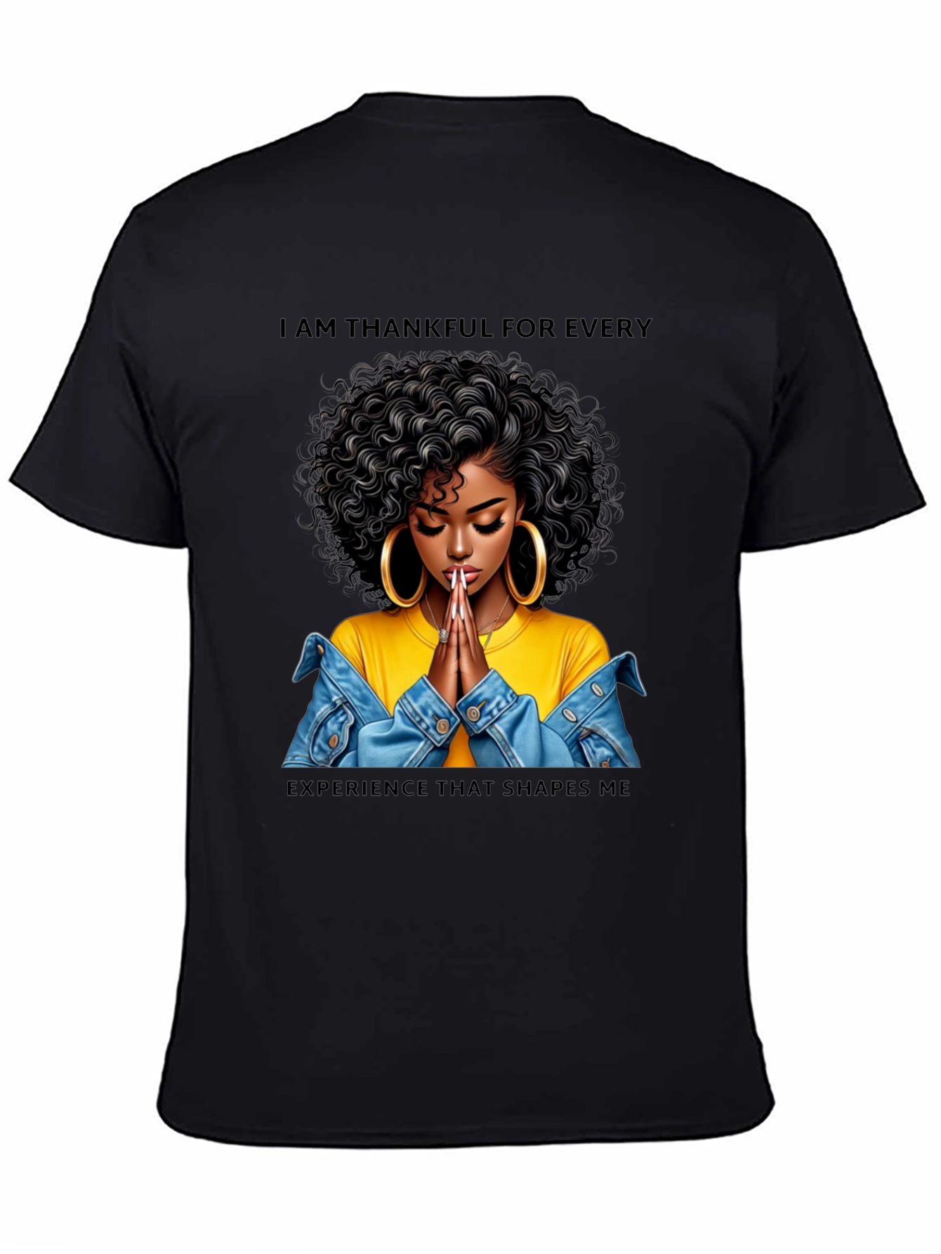 Show your appreciation with this stylish black graphic T-shirt. The shirt features a beautiful woman with curly hair and large hoop earrings, hands folded in prayer, wearing a yellow top and denim jacket. Above and below the image, the shirt reads, "I AM THANKFUL FOR EVERY EXPERIENCE THAT SHAPES ME". This T-shirt is perfect for casual wear, expressing gratitude, or making a fashion statement. Ideal for everyday wear, inspirational events, or as a thoughtful gift.