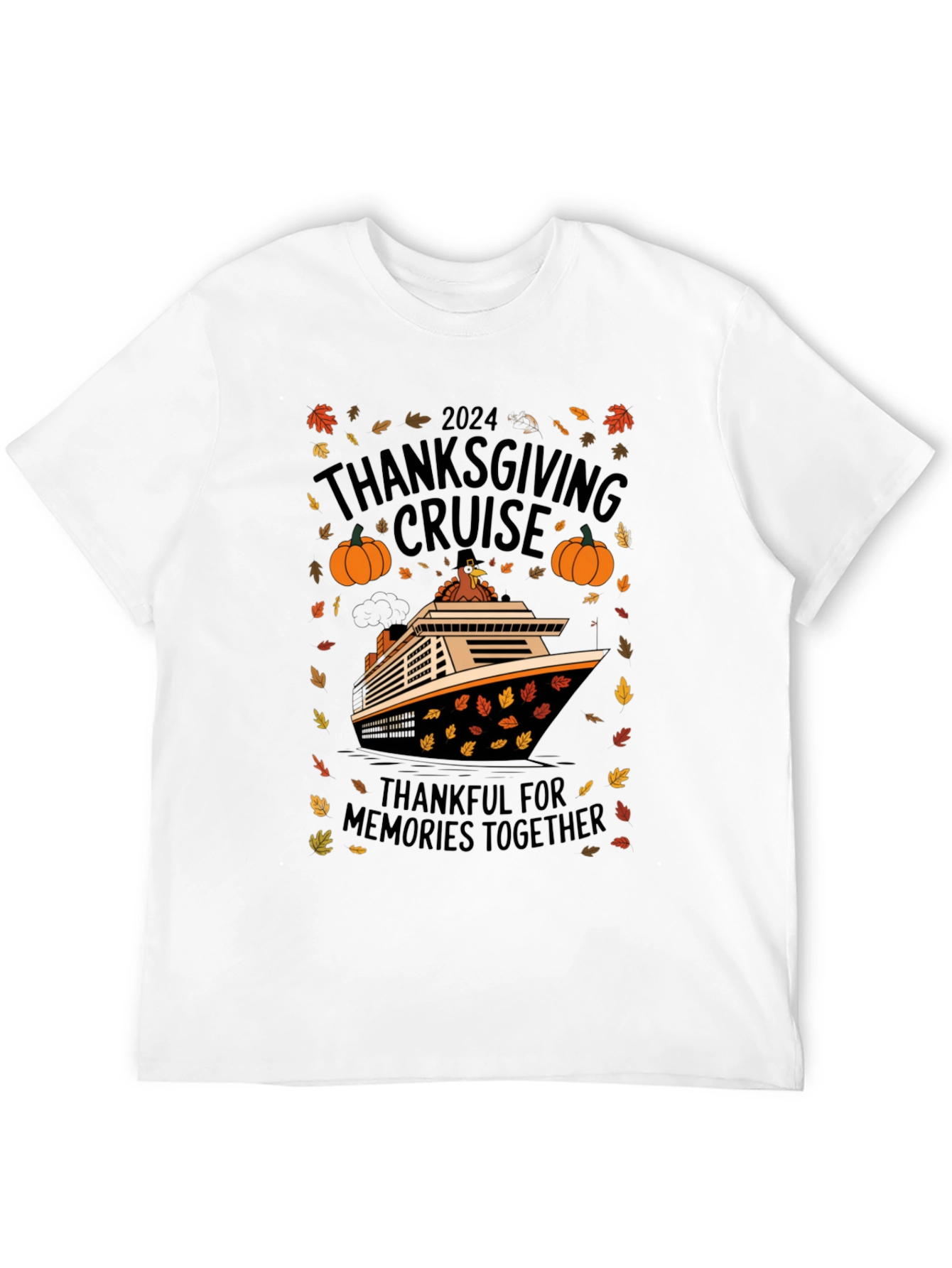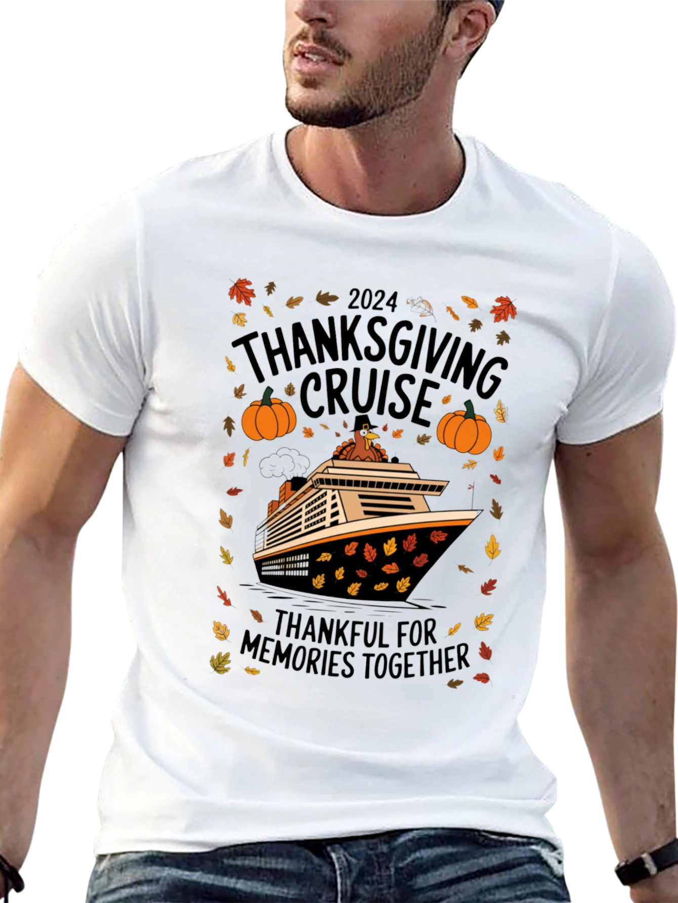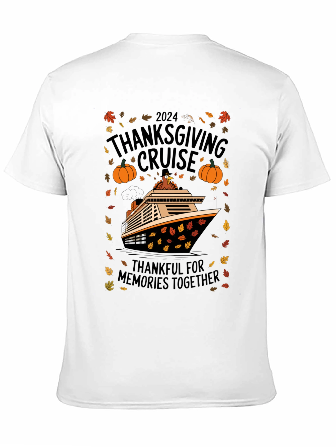 Celebrate Thanksgiving in style with this unique cruise-themed t-shirt! The black tee features a festive design, including a cruise ship adorned with fall leaves and pumpkins. "Thanksgiving Cruise 2024" is prominently displayed, surrounded by seasonal foliage. The words "Thankful for Memories Together" appear at the bottom, adding a heartwarming touch. Ideal for Thanksgiving gatherings, cruise vacations, or simply expressing holiday spirit. Made from comfortable materials, this t-shirt is a great way to commemorate a special Thanksgiving cruise.