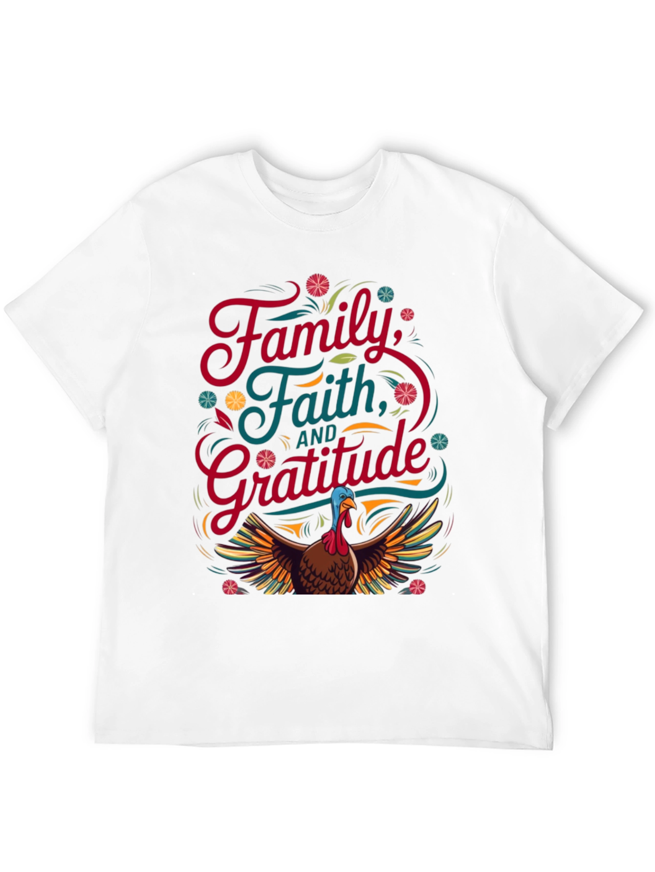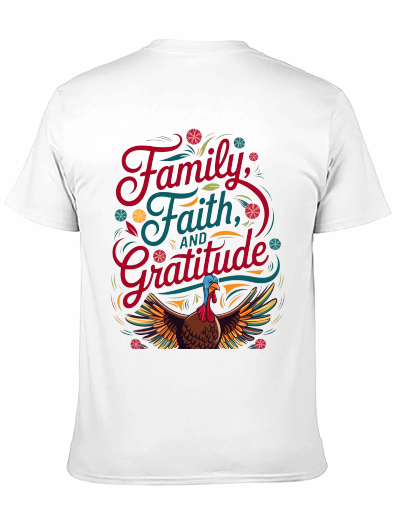 Celebrate Thanksgiving in style with this unique black T-shirt. The design features the words "Family, Faith, and Gratitude" in colorful lettering. Underneath, a detailed graphic of a turkey with outstretched wings adds a festive touch. The vibrant colors and playful design make it a perfect choice for Thanksgiving gatherings, casual outings, or simply expressing your gratitude. This T-shirt is sure to bring smiles and spark conversations wherever you go, making it a memorable addition to your holiday wardrobe.