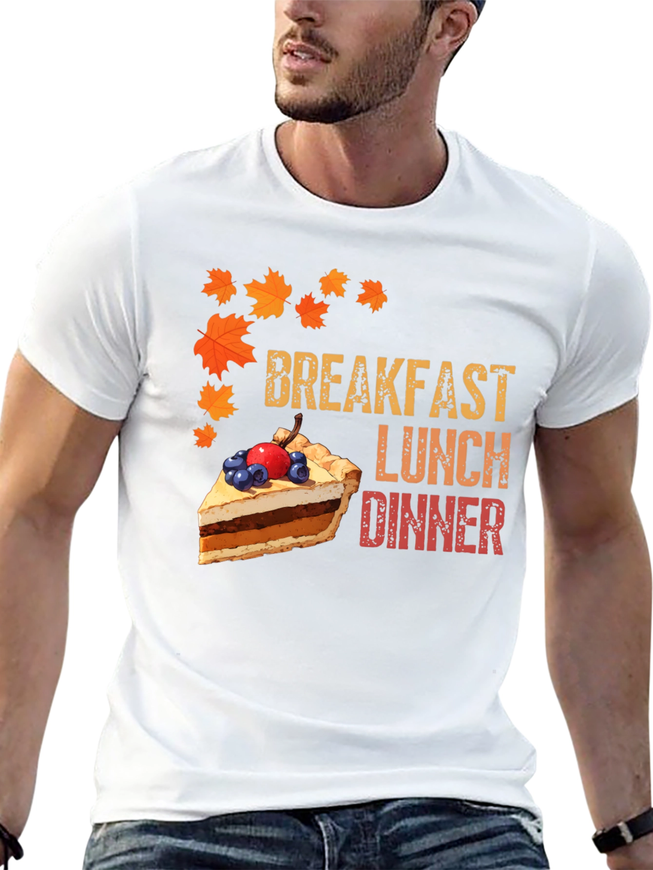 Celebrate Thanksgiving with this unique t-shirt! The black tee features a slice of pie topped with blueberries and a cherry, alongside the words 'Breakfast, Lunch, Dinner' in festive fall colors, surrounded by autumn leaves. Made from a comfortable, breathable fabric, this shirt is perfect for Thanksgiving dinner, casual gatherings, or just showing your love for the holiday. Its relaxed fit ensures all-day comfort. A must-have for pie enthusiasts and anyone who loves Thanksgiving!