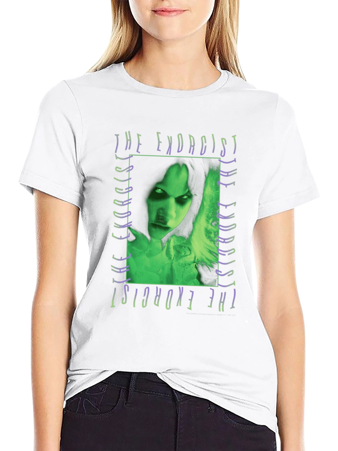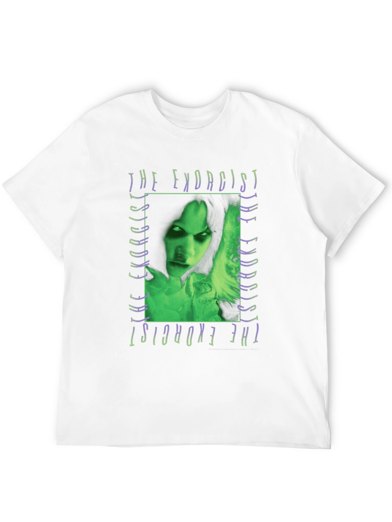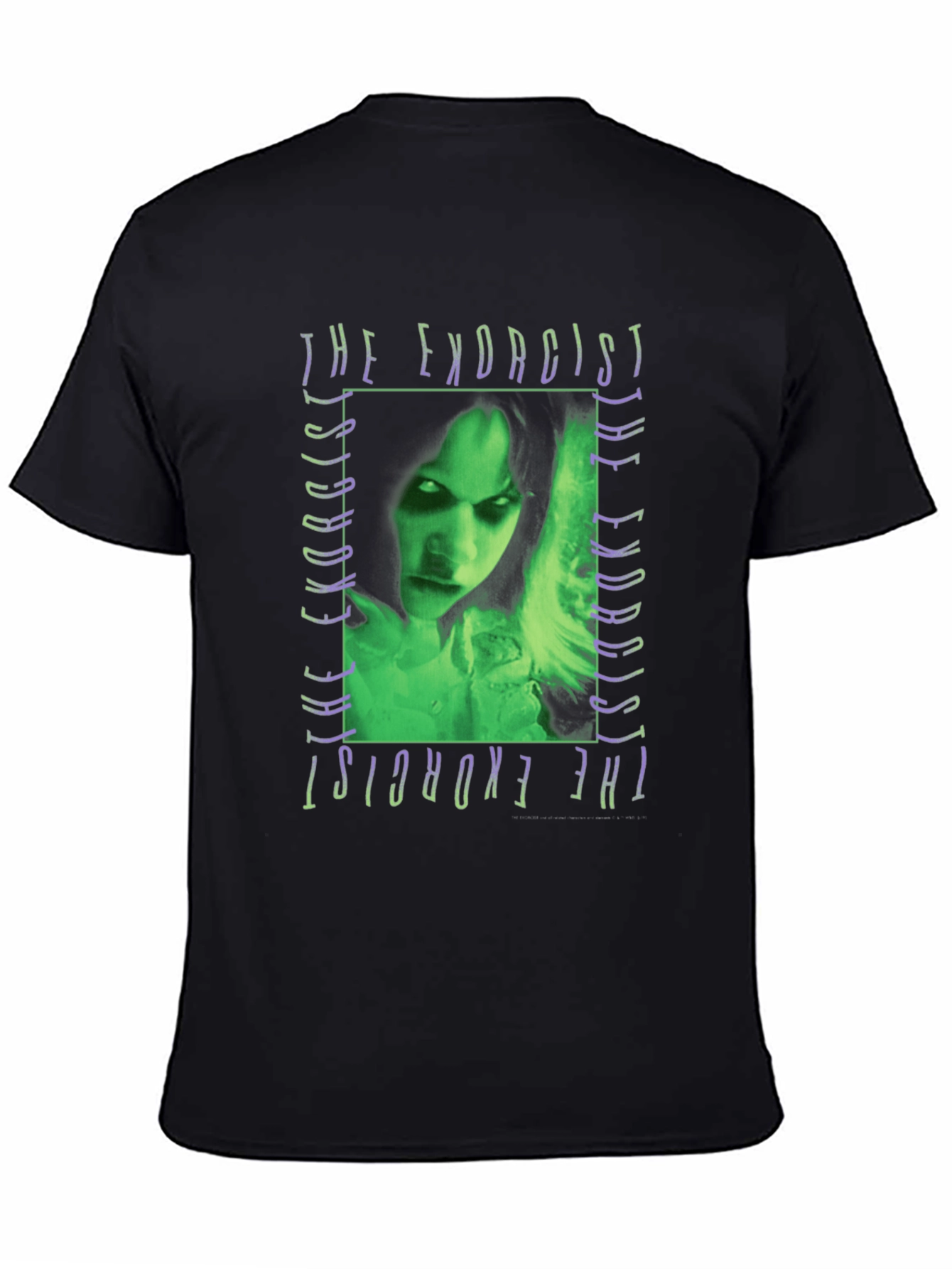 Step into the world of horror with this captivating t-shirt featuring a vivid graphic of The Exorcist. Crafted from comfortable, breathable fabric, this black tee showcases a striking green and purple design. The iconic image from the movie adds a touch of vintage cool to your wardrobe. Perfect for fans of classic horror films, casual wear, or making a bold statement. Wear your love for cinema with this distinctive and eye-catching piece. Get ready to turn heads and spark conversations wherever you go.
