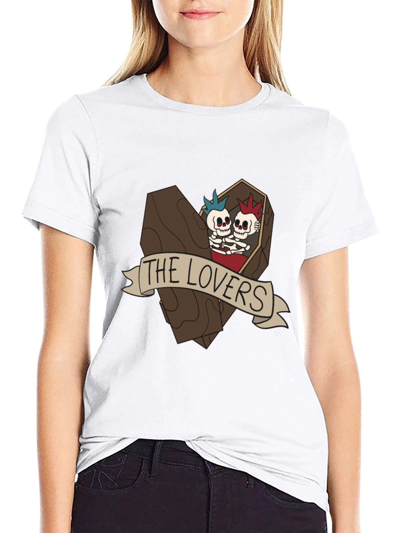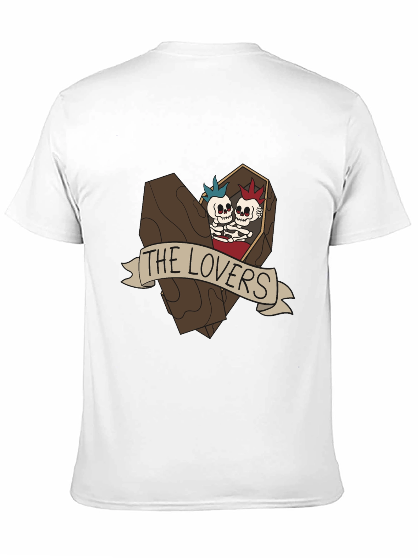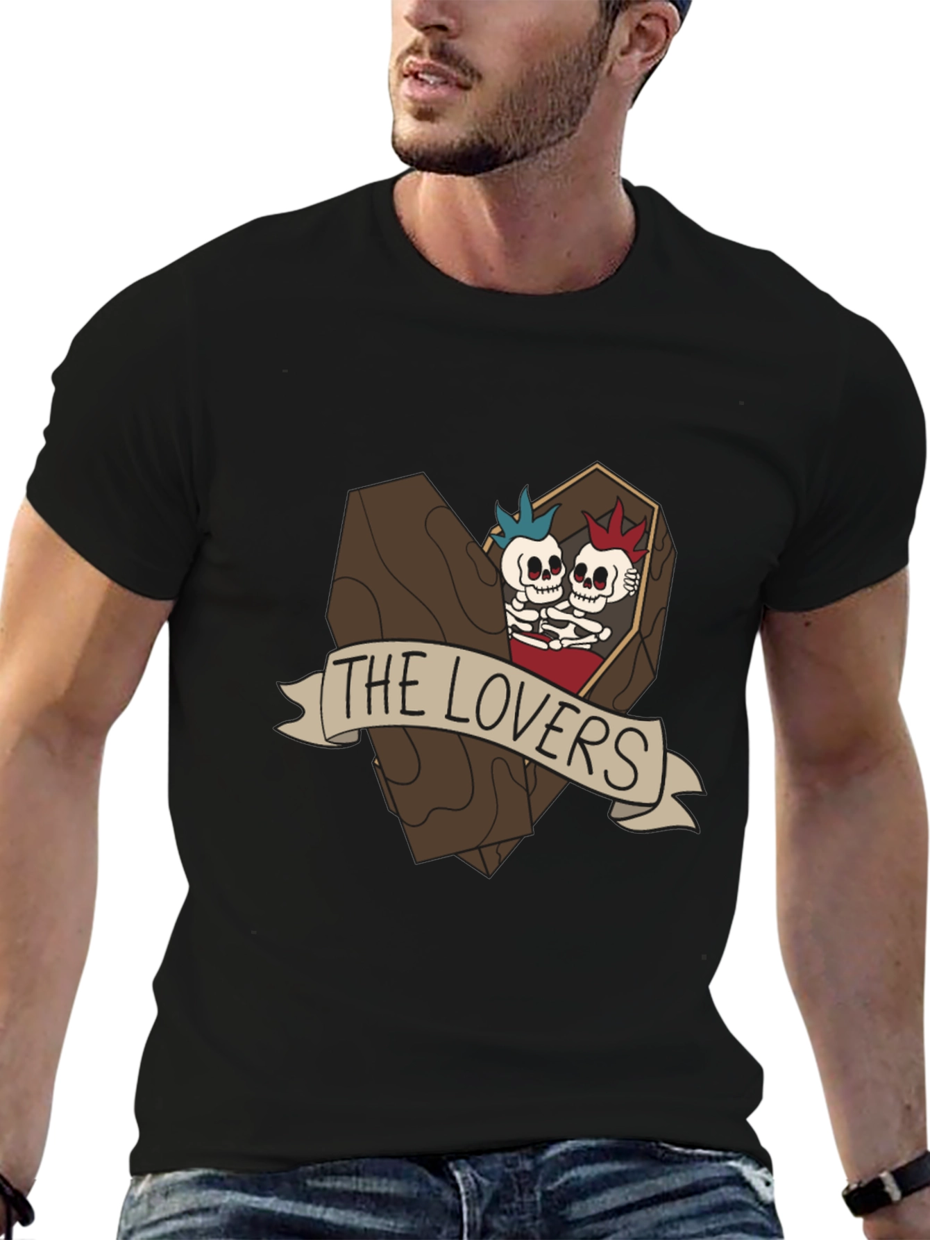 Show off your unique style with this eye-catching black t-shirt. Crafted from soft cotton, this tee features a bold graphic of two punk-rock skeleton lovers in a coffin with a "The Lovers" banner. The design is detailed and stands out. Comfortable and versatile, this t-shirt is perfect for casual wear, concerts, or expressing your individuality. Pair it with jeans, shorts, or a skirt for a trendy, edgy look. A great gift for anyone with a quirky sense of humor or an appreciation for alternative fashion.