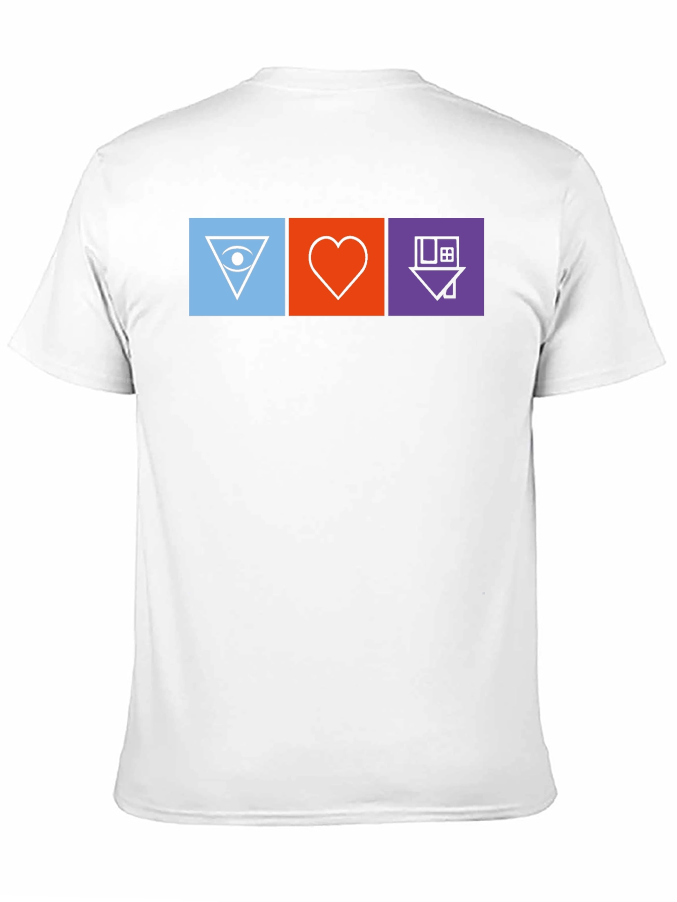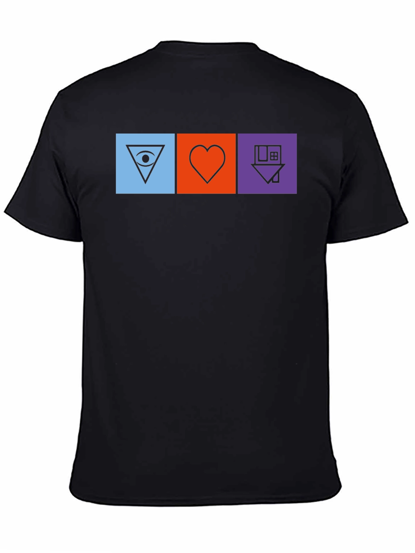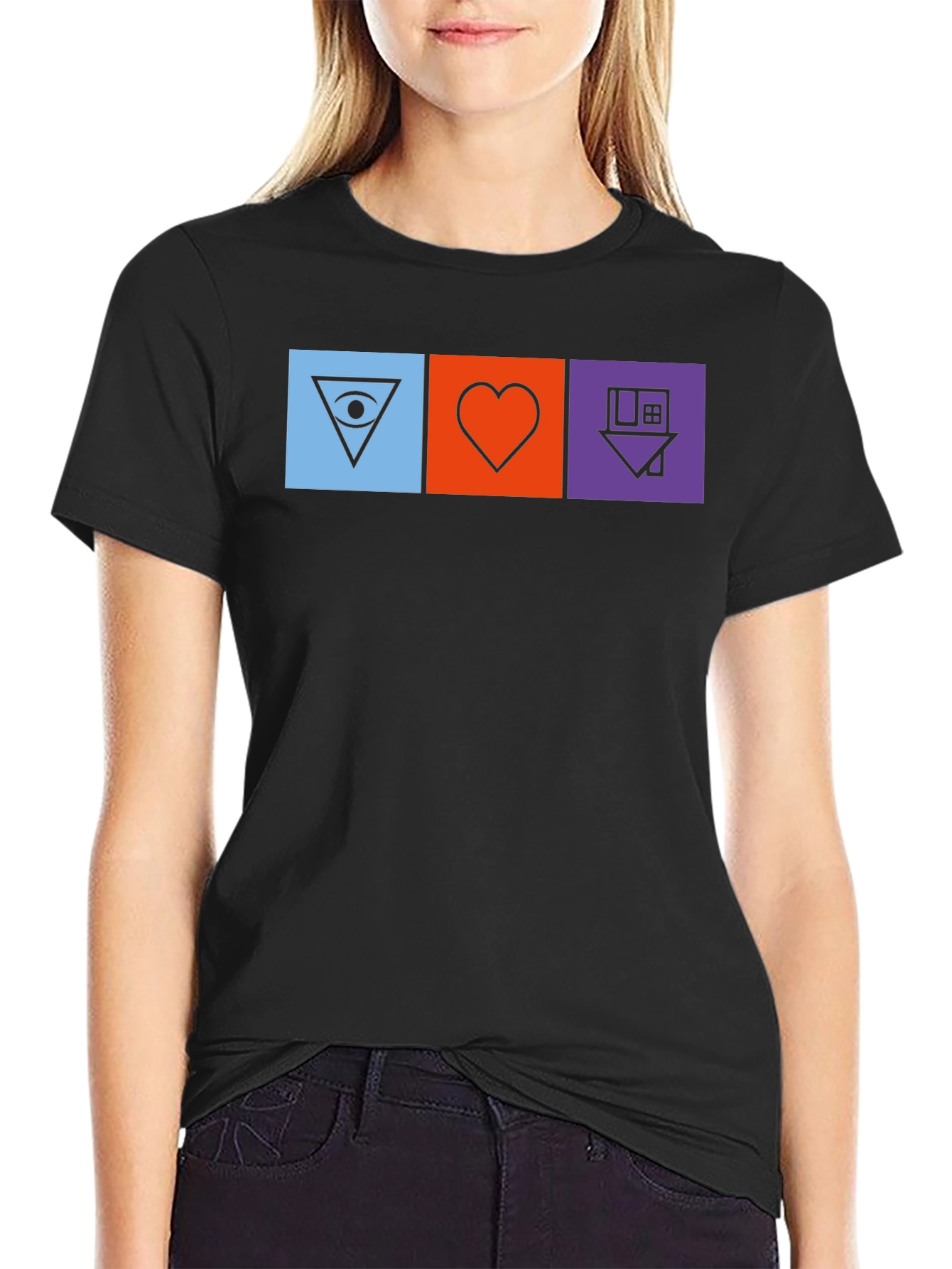 Show your love for The Neighbourhood with this stylish black t-shirt. It features iconic symbols representing the band: an eye inside a triangle, a heart, and a house - each showcased within a square of light blue, orange, and purple, respectively. Made from comfortable, breathable fabric, this t-shirt is perfect for everyday wear or for showing your support at concerts. Stand out from the crowd with this eye-catching design that captures the essence of The Neighbourhood's music. Get yours today!