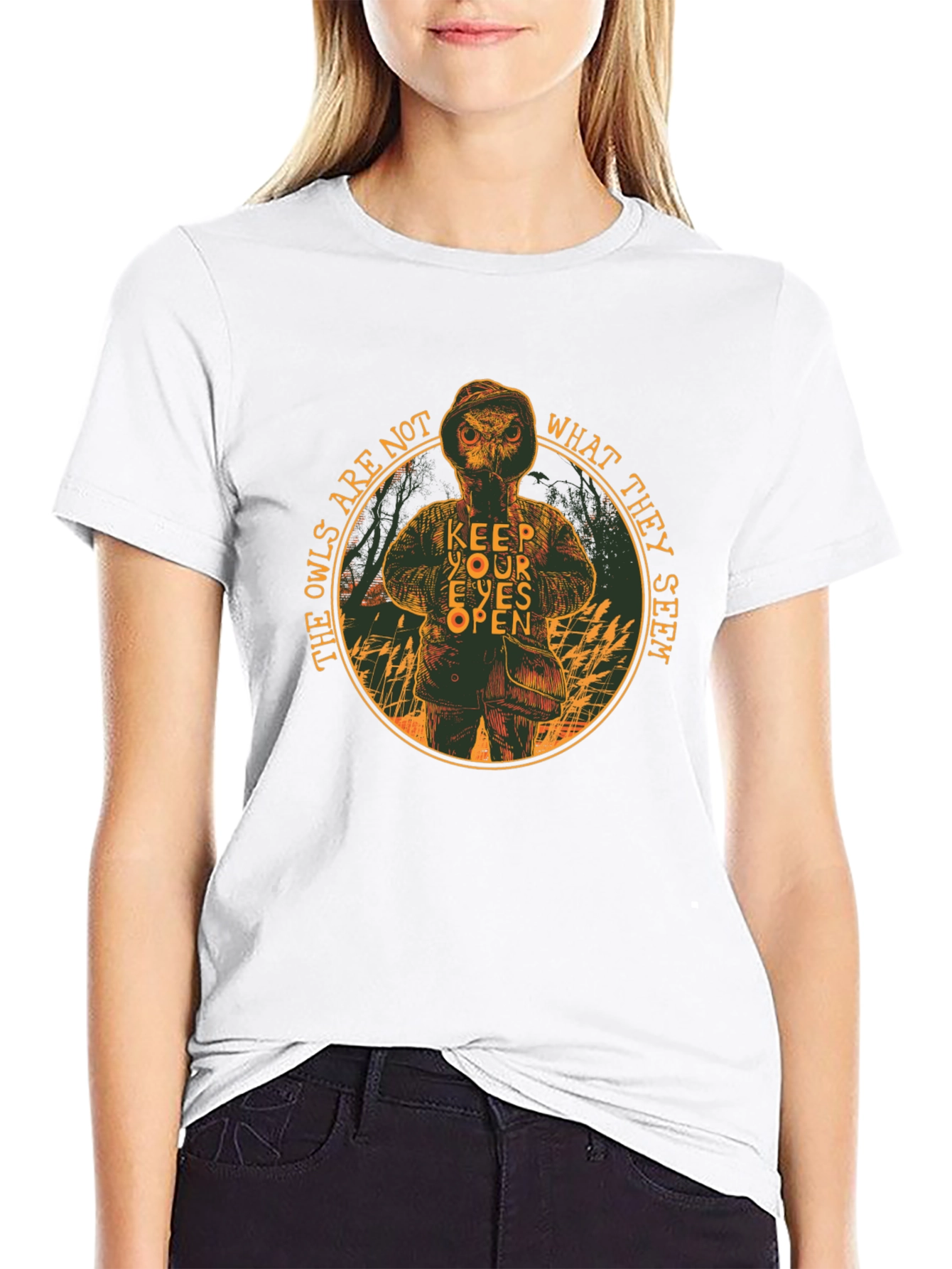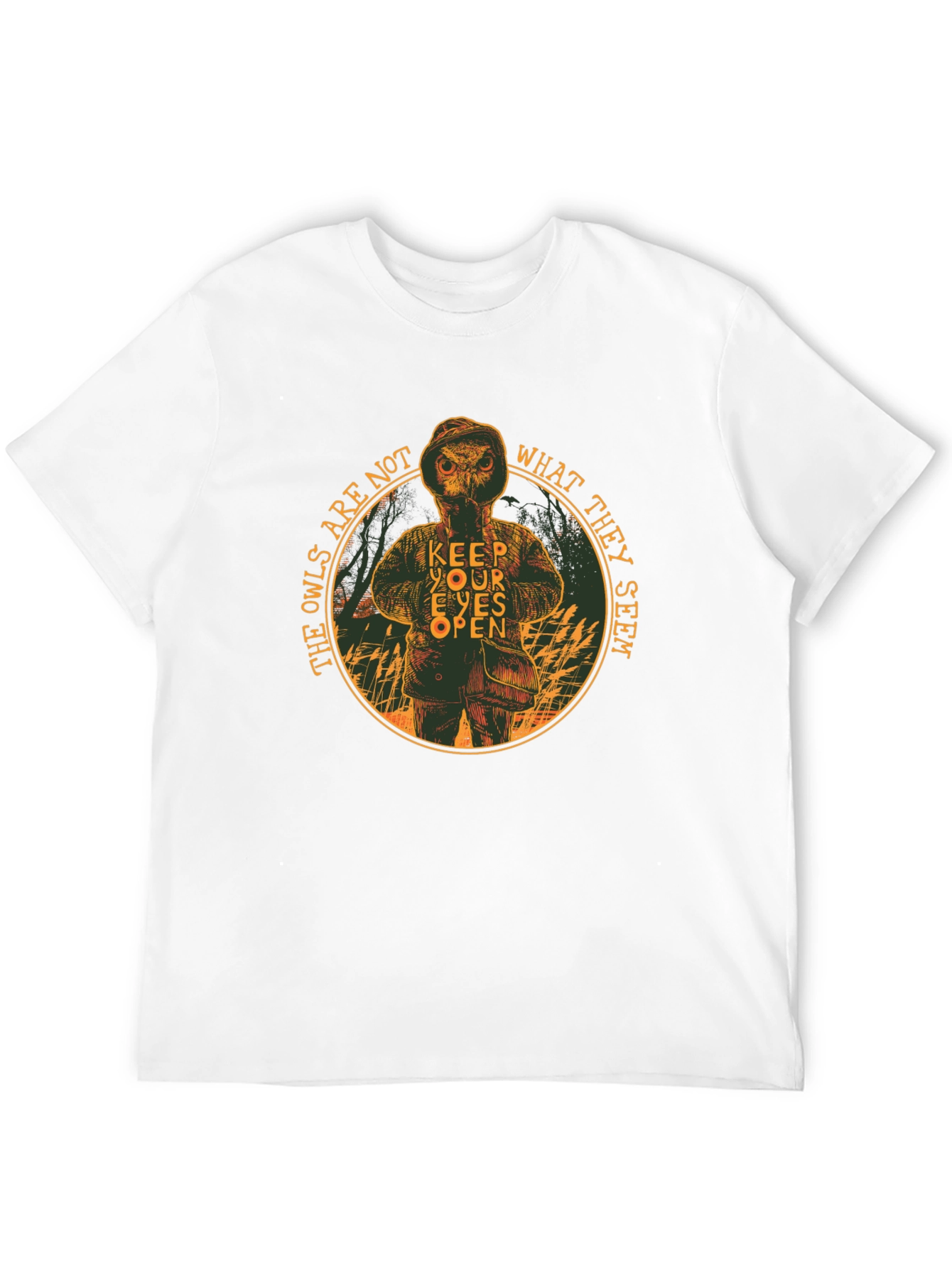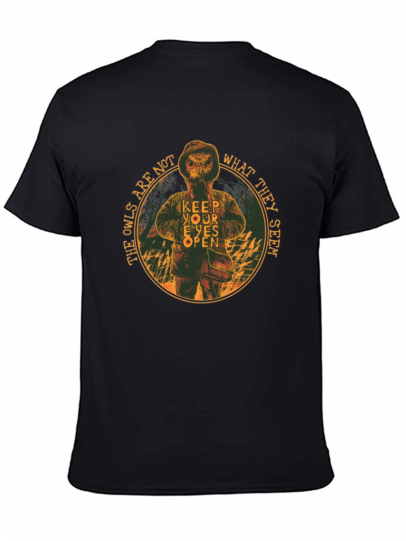 Show off your unique style with this eye-catching black graphic tee. The shirt features a circular design showcasing an owl-like figure with the intriguing message "Keep Your Eyes Open" surrounded by the phrase "The Owls Are Not What They Seem". The vintage-inspired design gives it a cool, retro feel. Made from comfortable, breathable fabric, this t-shirt is perfect for everyday wear. Whether you're a fan of mystery themes or just love unique graphic designs, this tee is a great addition to your wardrobe. Pair it with jeans or shorts for a casual look that stands out.