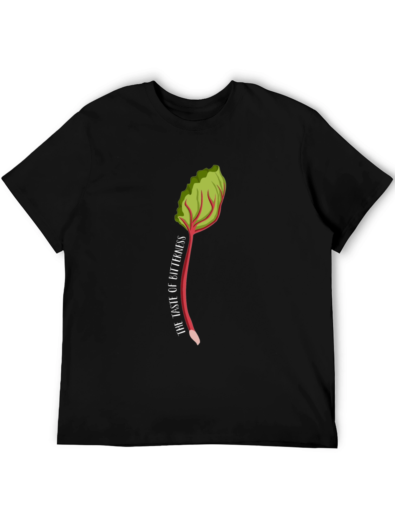 Embrace the unexpected with this unique graphic tee. Featuring a striking illustration of a rhubarb stalk with the playful text "The Taste of Bitterness," this shirt is perfect for those who appreciate irony and distinctive design. Crafted from a comfortable black fabric, it offers a classic fit suitable for everyday wear. The bold graphic adds a touch of whimsy and personality to any outfit, making it an excellent conversation starter. Wear it to casual gatherings, concerts, or simply while running errands, and showcase your one-of-a-kind style. Let your wardrobe reflect your unique perspective with this eye-catching and thought-provoking t-shirt.