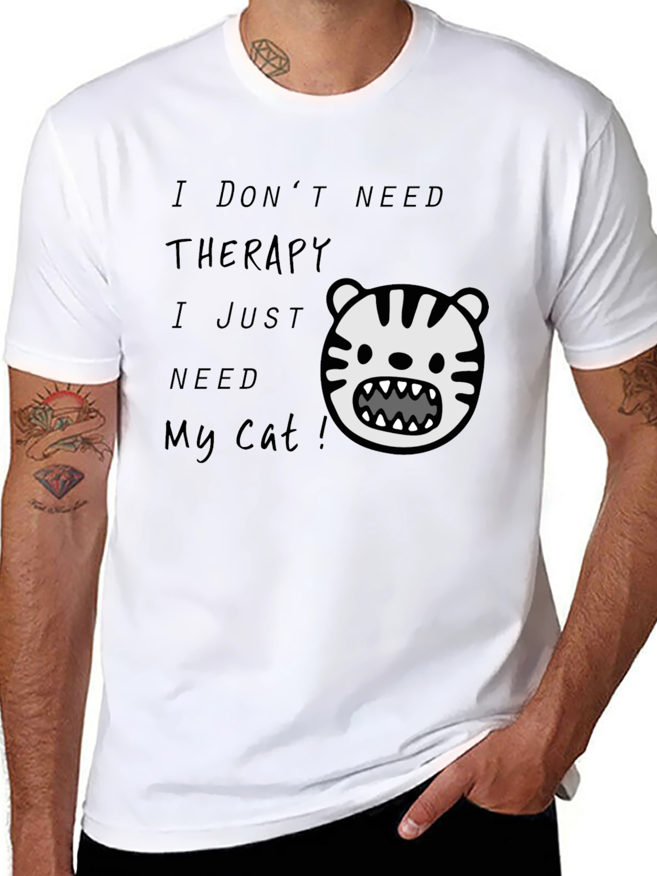 Express your love for cats with this unique black t-shirt! Featuring a playful, cartoon-style cat graphic and the witty saying 'I DON'T NEED THERAPY I JUST NEED My Cat!', this shirt is perfect for cat lovers with a sense of humor. Made from soft, comfortable cotton, it's ideal for everyday wear. Show off your feline affection and make a statement with this eye-catching tee. A great gift for cat owners or a fun addition to your own wardrobe. Get yours today!