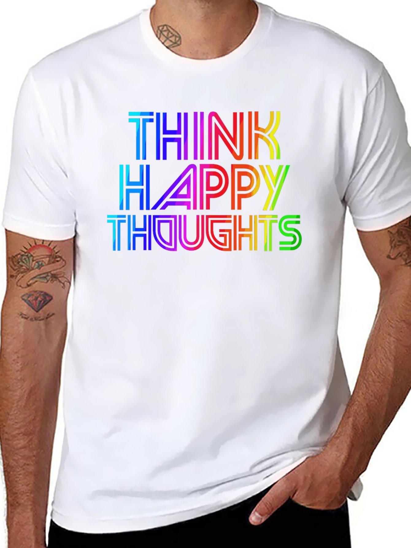 Spread positivity with this eye-catching black t-shirt featuring a vibrant, rainbow-colored design. The words "THINK HAPPY THOUGHTS" are stacked in a bold, modern font, creating a cheerful statement. Made from a soft, comfortable fabric, this tee is perfect for everyday wear. Show off your bright personality and inspire others with this unique and uplifting shirt. Ideal for casual outings, music festivals, or simply lounging at home. Get yours today and let your wardrobe radiate good vibes!